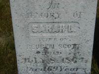 Sarah Louise Keeler was born on 22 May 1796 at Salem, Westchester Co., New York, U.S.A; Date 1795 & location USA per 1861 Census. Date 1795 & location USA per 1851 Census. Date May 22 1796 & location Salem, Westchester Co., NY per GEDCOM of Susan Barrett (tazzer416@yahoo.com) March 12 2017.1,4,3 She married Reuben Scott, son of Aaron Scott and Anne Hawley, before 1815 at Upper Canada; 1817 Census shows 1 male and one female - likely married by then. per 1861 Census.1 As of before 1815,her married name was Scott.1 Sarah Louise Keeler appeared on the census of 1852 at Cramahe Twp., Northumberland Co., Ontario; Age 56 at 1851 Census: see Reuben Scott.4 She appeared on the census of April 1861 at Cramahe Twp., Northumberland Co., Ontario; Age 66 at 1861 Census: see Rueben Scott.1 She died on 8 July 1864 at Cramahe Twp., Colborne, Northumberland Co., Ontario, at age 68; per family tree of BrownHartman on ancestry.com, Jun3 8 2011.3 She was buried on 10 July 1864 at Colborne East Cemetery, Colborne, Northumberland Co., Ontario; Memorial: (See Exhibit) In; Memory lf; Sarah L; Wife of; Reuben Scott; Died; July 8, 1864; Aged 69 Years (Colborne East Cemetery, Colborne, June 6, 2005.)5