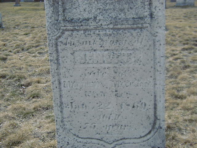 CemSearch: Name: Jennett Macklam; Born: 1793; Died: Jan 22 1869; Age: 75; ID: WOODS243; Other names: Macklam, Matthew (1794-1874); Cemetery: Woods Cemetery, Conc 1, Lot 12, Cramahe Twp., Northumberland Co., Sec S Row 3 Plot 9; Note: Wife of Matthew Macklam (https://www.cemsearch.ca/burial/?pid=WOODS243%5E1.)4,7