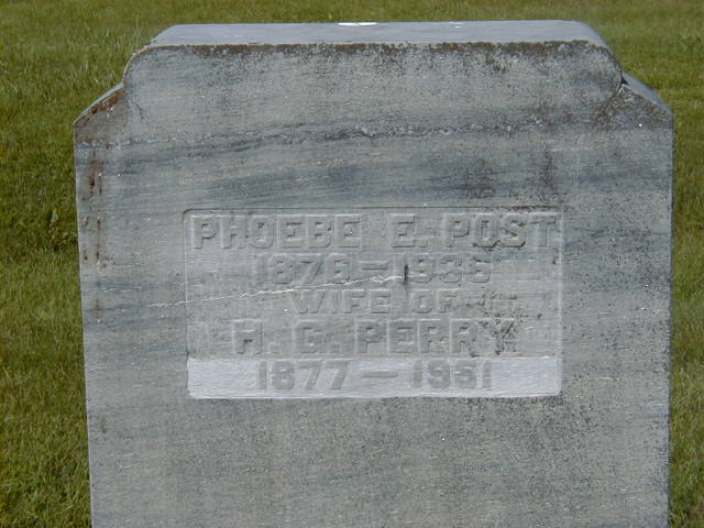 Phoebe Ella Post was born on 14 October 1876 at Brighton Twp., Smithfield, Northumberland Co., Ontario; Date 1876 per Memorial. Date 1877 & location Ont. per 1891 Census. Date Oct 14 1878 per GEDCOM of Elizabeth Archer, Apr 25 2009.1,2,3 She appeared on the census of 21 April 1891 at Brighton Twp., Northumberland East Co., Ontario; Age 14 at 1891 Census: see Richard Post.3 As of 7 September 1898,her married name was Perry.1 She married Harry Griffis Perry, son of Oliver "Byron" Perry and Ida Florence Griffis, on 7 September 1898 at Northumberland Co., Ontario; per GEDCOM of Elizabeth Archer, Apr 25 2009.1 Phoebe Ella Post died on 28 April 1936 at Ontario at age 59; Date 1936 per Memorial. Date Apr 28 1936 per GEDCOM of Elizabeth Archer, Apr 25 2009.1,2 She was buried on 30 April 1936 at Mount Hope Cemetery, Brighton, Northumberland Co., Ontario; Memorial: (See Exhibit) Phoebe E. Post; 1876 - 1936; Wife of; H. G. Perry; 1877 - 1961 (Mount Hope Cemetery, Brighton.)2
