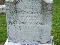 Alice Sophia Merrick was born on 27 March 1857 at Rawdon Twp., Hastings Co., Canada West; Date 1857 per Memorial. Date Mar 28 1857 & location Cda. per Death Reg'n. - age 68y 4m 19d per death Aug 16 1925. Date Mar 27 1853 & location Ont. rural per 1901 Census. Date 1857 & location Ont. per 1891 Census. Date 1857 & location Ont. per 1881 Census. Date 1856 & location Rawdon Twp. per marr. reg'n.1,5,4,6,7,3 She married James Donald, son of James Donald and Jane Hall, on 28 October 1879 at Rawdon Twp., Hastings Co., Ontario; Marriage Reg'n.#003929: Groom: James Donald; Age: 30; Res. & Born: Seymour Twp; Status: widower; Occ.: farmer; Parents: James & Jane Donald; Bride: Alice Sophia Merrick; Age: 23; Res. & Born: Rawdon Twp; Status: spinster; Parents: Isaac & Charlotte Merrick; Wit.: Oscar & Margaret Ann Merrick; Date: Oct 28 1879; Place: Rawdon Twp; Rel.: Meth. Episc; Performed by: R. W. Marsh; Reg'r.: Joseph Hogle (Ontario Marriage Registration, #003929-1879, ancesrtry.com) per 1901 Census.1,8 As of 28 October 1879,her married name was Donald.1 Alice Sophia Merrick appeared on the census of April 1881 at Seymour Twp., Northumberland Co., Ontario; Age 24 at 1881 Census: see James Donald.6 She appeared on the census of April 1891 at Seymour Twp., Northumberland Co., Ontario; Age 34 at 1891 Census: see James Donald.7 She died on 16 August 1925 at Rawdon Twp., Hastings Co., Ontario, at age 68; Death Reg'n.#015940: Name: Alice Sophia Donald; Date: Aug 16 1925; Age: 68y 4m 19d; Res.: Rawdon Twp., 18y; Born: Canada, Mar 27 1857; Status: widow; Parents: Isaac & Charlotte Merrick, b. Cda; Inf.: Wm. Donald, Harold, son; Burial: Burnbrae Cemetery, Aug 18 1925; Reg'd.: Aug 17 1925; Reg'r.: W. F. Bateman, Spring Brook (Ontario Death Registration, #015940-1925, ancestry.com) Date 1925 per Memorial. Date 1925 per email from Dave Rannie, Apr 28 2009.9,3 She was buried on 18 August 1925 at Burnbrae Cemetery, Seymour Twp., Northumberland Co., Ontario; Memorial: (See Exhibit) James Donald; 1849-1914; His Wife; Alice Sophia Merrick; 1857-1925; Wm. E. Donald - 1892-1965; His Wife; Ellen Wright; 1895-1982 (Burnbrae Cemetery, Seymour Twp., image from FindaGrave.) Per Death Reg'n.4,3,10