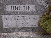 Ina E. Oddie was born on 5 October 1881 at Seymour Twp., Northumberland Co., Ontario; Date Oct 5 1881 per Memorial. Date Oct 5 1881 per email from Dave Rannie, May 10 2009. Date 1881 & location Ont. per marr. reg'n. per Birth Reg'n. of son Gordon Mitchell Rannie. Location Seymour Twp. per Death Reg'n. of daughter Gladys Munroe Rannie.1,3,2,4,5 She lived on 11 June 1902 at Seymour Twp., Northumberland Co., Ontario; Residence Seymour per marr. reg'n.3 As of 11 June 1902,her married name was Rannie.1 She married John Rannie, son of Alexander Rannie and Margaret Mitchell, on 11 June 1902 at Seymour Twp., Northumberland Co., Ontario; Marriage Reg'n.##012799: Groom: John Rannie; Age: 28; Res.: Seymour Twp; Born: Ont; Status: bachelor; Occ.: farmer; Parents: Alex Rannie & Margaret Mitchell; Bride: Ina Oddie; Age: 21; Res.: Seymour Twp; Born: Ont; Status: spinster; Parents: Thos. Oddie & Jane Munroe?; Wit.: Edward Rannie & Myrtil DeLong, Seymour; Date: Jun 11 1902; Place: Seymour Twp; Rel.: Pres; Performed by: Rev. J. Moon?; Reg'd.: Sep 17 1902; Reg'd.: J. B. Ferris (Ontario Marriage Registration, #012799-1902, ancestry.com) per Birth Reg'n. of son Gordon Mitchell Rannie.6 Ina E. Oddie died on 4 February 1976 at Ontario at age 94; Date Feb 4 1976 per Memorial. Date Feb 4 1976 per email from Dave Rannie, May 10 2009.4,5 She was buried on 23 April 1976 at Burnbrae Cemetery, Seymour Twp., Burnbrae, Northumberland Co., Ontario; Memorial: (See Exhibit) RANNIE; John Rannie; Apr. 11, 1874 - Nov. 7, 1952; His Wife; Ina E. Oddie; Oct. 5, 1931 - Feb. 4, 1976 (Burnbrae Cemetery, Seymour Twp., Nov 26 20211, by Dan.)5