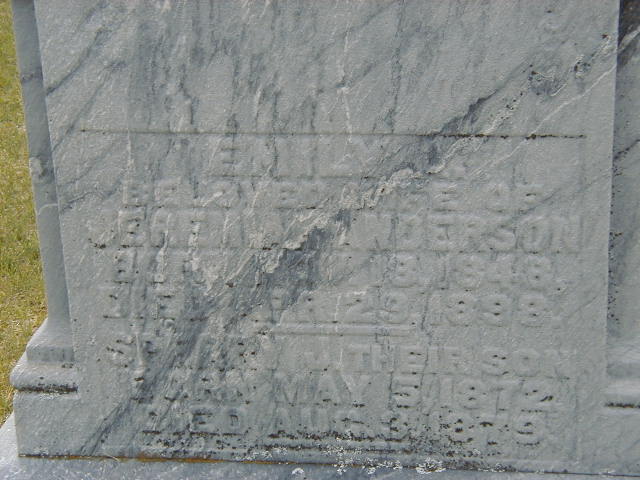 Emily A. "Emma" Vandervoort was born on 18 November 1848 at Sidney Twp., Hastings Co., Canada West; Date Nov 18 1848 per Memorial. Date 1850 & location Ont. per 1891 Census. Date 1852 & location Ont. per 1881 Census. Date 1851 & location Sidney Twp. per marr. reg'n. Date Nov 18 1849 per GEDCOM of Robert Graham, June 29, 2009.1,2,3,4,5 She appeared on the census of April 1861 at Brighton Twp., Northumberland Co., Canada West; Age 13 at 1861 Census: see David Vandervoort.6 She lived on 22 May 1871 at Sidney Twp., Hastings Co., Ontario; Residence Sidney per marr. reg'n.3 As of 22 May 1871,her married name was Anderson.1 She married Jeremiah Anderson, son of Joshua Anderson and Margaret Maria Ouderkirk, on 22 May 1871 at Murray Twp., Northumberland Co., Ontario; Marriage Reg'n.: Groom: Jeremiah Anderson; Age: 23; Res. & Born: Murray; Status: bachelor; Occ.: farmer; Parents: Joshua & Margaret Anderson; Bride: Emily E. Vandervoort; Age: 20; Res. & Born: Sidney; Status; spinster; Parents: David & Elizabeth Vandervoort; Wit.: David Vandervoort & Sarah Anderson; Date: May 22 1871; Place: Murray Twp; Rel.: WM; Performed by: Samuel C. ?Phely? (Ontario Marriage Registration, ancestry.ca) Not married per 1871 Census. per GEDCOM of Robert Graham, June 29, 2009.1,7,3 Emily A. "Emma" Vandervoort appeared on the census of April 1881 at Sydney Twp., Hastings West Co., Ontario; Age 32 at 1881 Census: see Jeremiah Anderson.4 She appeared on the census of April 1891 at Sydney Twp., Hastings West Co., Ontario; Age 41 at 1891 Census: see Jeremiah Anderson.2 She died on 29 April 1898 at Deseronto St., Trenton, Hastings Co., Ontario, at age 49; Death Reg'n.#007948: Name: Emily Anderson; Date: Apr 29 1898; Age: 49; Res.: ?Deseronto St.?, Trenton; Born: Murray Twp; Cause: heart failure; Phys.: Dr. H. L.? ?Forley?; Rel.: Meth; Inf.: John c. ?Roseland?; Reg'd.: Apr 30 1898; Reg'r.: ?Geo. H. Gordon (Ontario Death Registration, #007948-1898, ancestry.ca) Date Apr 29 1898 per Memorial. Date 1898 per GEDCOM of Robert Graham, June 29, 2009.1,5,8 She was buried on 1 May 1898 at Stockdale Cemetery, Murray Twp., Stockdale, Northumberland Co., Ontario; Memorial: (See Exhibit) Emily A; Beloved Wife of; Jeremiah Anderson; Born Nov. 18 1848; Died Apr 29, 1898; Sperry J., their son; Born May 5, 1872; Died aug 3, 1879 (Stockdale Cemetery, Stockdale, May 26 2006.)5