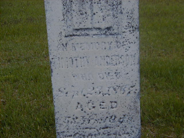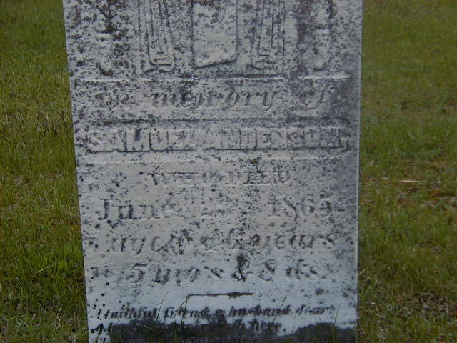 Samuel Anderson was born on 15 January 1819 at Murray Twp., Northumberland Co., Upper Canada; Date Jan 15 1819 per Memorial. Date 1818 & locaiton UC per 1861 Census. Date 1817 & location CW per 1851 Census. per GEDCOM of Robert Graham, June 29, 2009.1,2,3,4 He lived on 17 July 1845 at Murray Twp., Northumberland Co., Ontario; Residence Murray per marriage register.5 He married Elizabeth Terry, daughter of Benjamin Terry and Mary "Polly" Andress, on 17 July 1845 at Prince Edward Co., Canada West; Marriage Register: Groom: Samuel Anderson; Res.: Murray; Bride: Elizabeth Terry; Res.: Hillier; Wit.: William Terry & Thomas Anderson; Date: July 17 1845; Performed by: Rev. William McFadden, Wesleyan Methodist Church of Canada (Ontario Marriage Registers, Vol. 21, Prince Edward Co., 1846 - ancestry.ca)Date Jul 17 1845 & location Prince Edward Co. per GEDCOM of Robert Graham, June 29, 2009.1,5 Samuel Anderson appeared on the census of 1848 at Conc 8 Lot 12, Murray Twp., Northumberland Co., Canada West; 1848 Census: Samuel Anderson; Lot 12, Conc 8, non-prop; farmer. He appeared on the census of 1850 at Conc 7 Lot 12, Murray Twp., Northumberland Co., Canada West; 1850 Census: Samuel Anderson; Lot 12, Conc 7, non-prop; 7 persons. He appeared on the census of 1852 at Murray Twp., Northumberland Co., Ontario; Age 34 at 1851 Census: Anderson, Samuel, 34, b. Cda. W., WM, farmer, married; Elizabeth, 29, b. CW, no rel., married; William, 5, b. Cw, WM (1851 Census: Murray Twp., Northumberland Co., pg. 102 of 172, line 37 - ancestry.ca.)4 He appeared on the census of April 1861 at Murray Twp., Northumberland Co., Canada West; Age 43 at 1861 Census: Anderson, Samuel, 43, b. UC, WM, farmer, married; Elizabeth, 40, b. UC, WM, married; William, 13; Lydia, 8 (1861 Census: Murray Twp., Northumberland Co., pg. 30 of 899, line 33 - ancestry.ca.)3 He died on 23 June 1865 at Canada West at age 46; Date Jun 23 1865 per Memorial. per GEDCOM of Robert Graham, June 29, 2009.1,2 He was buried on 25 June 1865 at Stockdale Cemetery, Stockdale, Northumberland Co., Canada West; Memorial: (See Exhibit) In Memory of; Samuel Anderson; Who Died; June 23, 1865; Aged 46 years; 5 mo's & 8 d's (Stockdale Cemetery, Stockdale, May 26 2006.)2