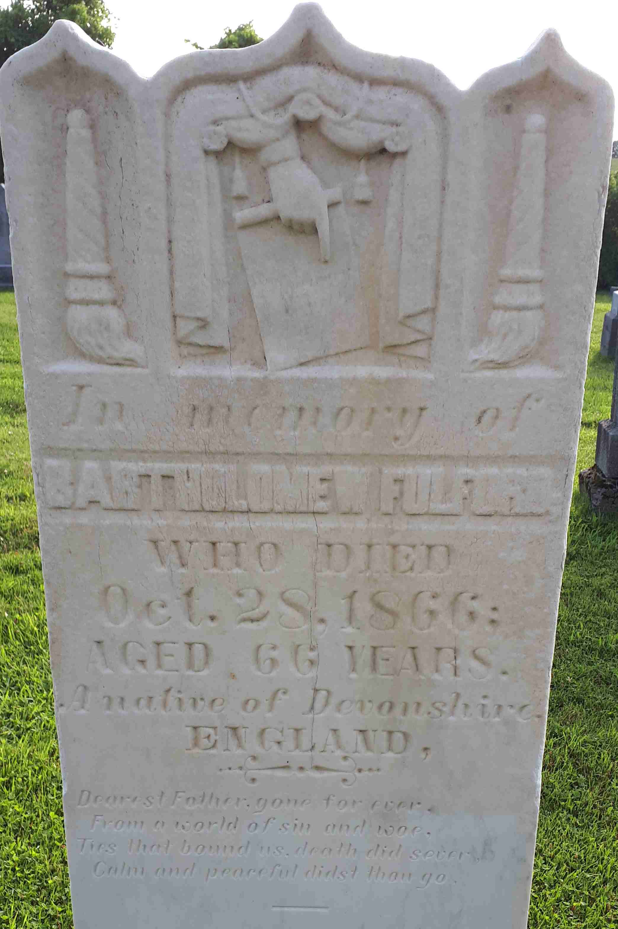 Bartholemew Fulford was born in July 1800 at Buckland Brewer, Devonshire, England; Date 1800 & location Devonshire, England per Memorial & CemSearch. Date 1800 & location England per 1861 Census. Date 1799 & location England per 1851 Census. Location England per Death Reg'n. of daughter Alice (Fulford) Sherwood. Date c. July 1800 & location Buckland Brerwer, Devon, England per family tree of Colleen Evans on ancestry.ca, Sep 15 2021.1,3,2,4,5,6 He married Harriet Bale, daughter of Edward Bale and Elizabeth Dennis, on 1 November 1827 at Norham, Devon, England; Date Nov 1 1827 & location Norham, Devon, England per family tree of Colleen Evans on ancestry.ca, Sep 15 2021. per 1851 Census.3,4 Bartholemew Fulford married Prudence Bale circa June 1848 at Bideford, Devon, England; per family tree of Colleen Evans on ancestry.ca, Sep 15 2021.4 Bartholemew Fulford appeared on the census of March 1852 at Brighton Twp., Northumberland Co., Canada West; Age 52 at 1851 Census: Fulford, Bartholemew, 52, b. England, WM, Blacksmith, married; Prudence, 33, b. England, WM, married; Edward, 24, b. England, WM, Blacksmith, single; John, 22, b. England, WM, Carpenter, single; Elizabeth, 17, b. England, WM; Harriet, 15, b. England; Alice, 10, b. England (1851 Census: Brighton Twp., pg. 116 of 160, line 1 - ancestry.com.)3 He appeared on the census of April 1861 at Brighton Twp., Northumberland Co., Canada West; Age 61 at 1861 Census: Fulford, B.(m), 61, b. England, Wm, farmer, married; Prudence, 43, b. England, WM, married; Way, Harriet, 23, b. England, WM, married; Abbot, 24, b. UC, WM, lab., married; Fulford, A.(f), 19, b. England, WM, single; William, 63, b. England, WM, lab., single; Way, Ida, 1, b. UC, WM (1861 Census: Brighton Twp., Northumberland Co., pg. 340 of 899, line 13 - ancestry.com.)2 He died on 28 October 1866 at Brighton Twp., Northumberland Co., Canada West, at age 66; Date Oct 28 1866 per Memorial & CemSearch. Date Oct 28 1866 per family tree of Colleen Evans on ancestry.ca, Sep 15 2021.4,5,6 He was buried on 30 October 1866 at Carman Cemetery, Brighton Twp., Carman, Northumberland Co., Canada West; Memorial: (see Exhibit) In Memory of; Bartholomew Fulford; Who Died; Oct. 28 1866; Aged 66 Years; A Native of Devonshire; England (Carman Cemetery, Brighton Twp., Oct 14 2021 by Dan)