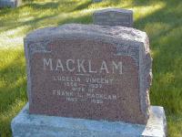 Frank Leslie Macklam was born on 7 April 1862 at Brighton Twp., Northumberland Co., Canada West; Date 1863 per Memorial. Date Apr 1863 & location Ont. per 1911 Census. lDate Apr 7 1862 & location Ont. rural per 1901 Census. Date 1863 & location Ont. per 1891 Census. Date 1862 & location Ont. per 1881 Census. Date 1863 & location Brighton Twp. per marr. reg'n.1,2,3,4,5,6 He appeared on the census of April 1881 at Brighton Twp., Northumberland Co., Ontario; Age 19 at 1881 Census: see Thomas Macklam.2 He lived on 15 January 1884 at Brighton Twp., Northumberland Co., Ontario; Witness at marriage of Alva W. Metcalf & Sophia Ann Macklam.1 He married Lucelia M. "Celia" Vincent, daughter of Stephen Vincent and Mary Matilda Scott, on 16 June 1886 at Brighton Twp., Northumberland Co., Ontario; Marriage Reg'n.#008479: Groom: Frank Leslie Macklam; Age: 23; Res. & Born: Brighton Twp; Status: bachelor; Occ.: farmer; Parents: Thomas Macklam & Elizabeth Mullett?; Bride: Cecelia M. Vincent; Age: 26; Res. & Born: Brighton; Status: spinster; Parents: Stephen Vincent & Mary Scott; Wit.: John & Sarah Vincent, Brighton; Date: Jun 16 1886; Place: Brighton; Rel.: Meth; Performed by: T. Meyers?; Reg'r.: M. K. Lockwood (Ontario Marriage Registration, #008479-1886, ancestry.com.)7 Frank Leslie Macklam lived on 16 June 1886 at Brighton Twp., Northumberland Co., Ontario; Residence Brighton Twp. per marriage reg'n. - Cecelia M. Vincent.1 He appeared on the census of April 1891 at Brighton Twp., Northumberland Co., Ontario; Age 28 at 1891 Census: see Thomas Macklam.6 He lived in 1896 at Conc 1 Lot 10, Brighton Twp., Northumberland Co., Ontario; "Macklam F. L, Brighton, f, Conc 1, Lot 10" Cda. Directories, 1896, Brighton Twp., ancestry.com.8 He appeared on the census of April 1901 at Brighton Twp., Northumberland Co., Ontario; Age 39 at 1901 Census: Macklam, Frank L., 39, b. Ont. r. Apr 7 1862, Irish, Pres., farmer, married; Celia L.?, 42. b. Ont. r. Jul 7 1859, Irish, Pres., married; Mable M., 13, b. Ont. r. Jan 13 1888, daughter; Dora J., 11, b. Ont. r. Jul 29 1889, daughter (1901 Census: Brighton Twp., Northumberland Co., dist. 95, sub-dist. a-1, pg. 6, line 8 - ancestry.com.)4 He appeared on the census of 5 June 1911 at 65 St. Patrick St., Toronto Centre, York Co., Ontario; Age 48 at 1911 Census: Macklam, Frank L., 48, b. Ont. Apr 1863, Irish, Pres., Shipper, married; Celia, 50, b. Ont. Jul 1860, Eng., Pres., married; Mabel, 23, b. Ont. Jan 1887, Irish, Pres., daughter, single; dora, 21, b. Ont. Jul 1889, Irish, Pres., stenographer, daughter, single (1911 Census: Toronto Centre, Dist. 124, sub-dist. 3-21, Ward 4, pg. 8, line 40 - ancestry.com.)5 He died on 20 March 1956 at Ontario at age 93; Date 1956 per Memorial. "Macklam, Frank Leslie; died March 20, 1956; March 22, 1956" from index of Brighton Ensign, Trenton Public Library, Dec 21 2013.3,9 He was buried on 23 March 1956 at Wood's Cemetery, Cramahe Twp., Northumberland Co., Ontario; Memorial: (See Exhibit) MACKLAM; Lucelia Vincent; 1858 - 1937; Wife of; Frank L. Macklam; 1863 - 1956 (Wood's Cemetery, Cramahe Twp., Jul 3 2004.)3
