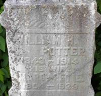 William Harris Potter was born on 15 May 1843 at Murray Twp., Northumberland Co., Canada West; Date 1843? per Memorial. Date 1846 & location Ont. per 1891 Census. Date 1843 & location Ont. per 1911 Census. Date May 18 1843 & location Ont. rural per 1901 Census. Date May 15 1843 & location Ont. per 1871 Census. Date 1843 & location UC per 1861 Census. Date 1845 & location Brighton per marr. reg'n. per GEDCOM of Cheryl Kemp Taber, Dec 7 2009.1,4,5,2,3,6,7,8 He appeared on the census of April 1861 at Brighton Twp., Northumberland Co., Canada West; Age 18 at 1861 Census: see Almond Potter.5 He appeared on the census of April 1871 at Brighton Twp., Northumberland Co., Ontario; Age 28 at 1871 Census: see Almond Potter.4 He lived on 27 November 1880 at Millbrook, Manitoba; Residence Millbrook, Manitobe per marr. reg'n.3 He married Margaret Elizabeth Huycke, daughter of John C. Huycke and Phoebe Ann Nugent, on 27 November 1880 at Ameliasburgh Twp., Prince Edward Co., Ontario; Marriage Reg'n.#009605: Groom: Wm. Harris Potter; Age: 35; Res.: Millbrook, Manitoba; Born: Brighton; Status: bachelor; Occ.: farmer; Parents: Almon & Mary Potter; Bride: Margaret E. Huycke; Age: 25; Res. & Born: Hillier; Status: spinster; Parents: John C. & Phebe A. Huycke; Wit.: Chas. W. Huycke, Hillier & Sarah H. Tomblin, Ameliasburgh; Date: Nov 27 1880; Place: Ameliasburgh; Rel.: Meth; Performed by: Rev. W. Tomblin; Reg'r.: James Benson, Ameliasburgh (Ontario Marriage Registration, #009605-1880, ancestry.ca) Date Dec 27 1880 & location Ameliasburgh Twp. per GEDCOM of Cheryl Kemp Taber, Dec 7 2009.1,9 William Harris Potter appeared on the census of 15 April 1891 at Brighton Twp., Northumberland East Co., Ontario; Age 45 at 1891 Census: Potter, William, 45, b. Ont., p.b. Ont., Meth., carpenter, married; Margaret, 35, b. Ont., p.b. Ont., Meth., married; John, 9; West, 3 (1891 Census: Brighton Twp., Northumberland East Co., dist. 98, sub-dist. a-1, pg. 16, line 14 - ancestry.ca.)6 He appeared on the census of 4 April 1901 at Brighton, Northumberland East Co., Ontario; Age 57 at 1901 Census: Potter, William, 57, b. Ont. r. May 18 1843, Eng., ?Pres.?, carpenter, married..... (1901 Census: Brighton Village, Northumberland East Co., dist. 95, sub-dist. 1, pg. 4, line 50 - ancestry.ca)