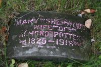 Mary Sherwood was born on 10 January 1825 at Murray Twp., Northumberland Co., Upper Canada; Date Jan 10 1825 & location Brighton per Death Reg'n. - age 93y 3m 10d at death Apr 20 1918. Date 1825 & location Cda. per 1892 Census. Date 1825 & location Ont. per 1881 Census. Date 1825 & location Ont. per 1871 Census. Date 1825 & locatin UC per 1861 Census. Date Jan 10 1825 & location Cramahe Twp. per GEDCOM of Cheryl Kemp Taber, Dec 7 2009.1,3,4,5,6,7 She married Almond Potter, son of Cyrus Potter and Maria B. Covell, on 20 January 1842 at Cramahe Twp., Northumberland Co., Canada West; per GEDCOM of Cheryl Kemp Taber, Dec 7 2009.1 As of 20 January 1842,her married name was Potter.1 Mary Sherwood appeared on the census of April 1861 at Brighton, Northumberland Co., Ontario; Age 36 at 1861 Census: see Almond Potter.4 She appeared on the census of April 1871 at Brighton Twp., Northumberland Co., Ontario; Age 46 at 1871 Census: see Almond Potter.3 She appeared on the census of April 1881 at Brighton Twp., Northumberland Co., Ontario; Age 56 at 1881 Census: Potter, Mary, 56, b. Ont., CM, Welsh, widow; Mary, 25, b. Ont., CM, Irish, single; Annie, 18; George, 16; Horrace, 14; Hariet, 9 (1881 Census: Brighton Twp., Northumberland Co., dist. 123, sub-dist. C, pg. 3, line 12 - ancestry.com.)6 She appeared on the census of 18 February 1892 at Rochester, Monroe Co., New York, U.S.A; Age 67 at 1892 Census: Potter, Mary, 67, b. Cda., alient; Anna, 30, b. Cda., Alien, Tailoress; Horace, 26, b. Cda., Alien, Machinist; Hattie, 21, b. Cda., Alien, Tailoress (1892 State Census: Rochester, Monroe Co., NY, Ward 14, pg. 4 of 12 - ancestry.com.)7 She died on 20 April 1918 at Sidney Twp., Belleville, Hastings Co., Ontario, at age 93; Death Reg'n.#010630: Name: Mary Potter; Date: Apr 20 1918; Age: 93y 3m 10d; Place: Belleville; Born: Brighton; Burial: Brighton; Status: widow; Parents: Samuel Sherwood & Maria Selick; Phys.: Dr. Connor, Belleville; Inf.: Mrs. Annie Bates, Belleville, RR; Reg'd.: Apr 23 1918; Cause: apoplexy, 6 days; Reg'r.: W. H. Nobes?, Sidney Twp. (Ontario Death Registration, #010630-1918, ancestry.com) Date Apr 20 1918 & location Belleville per GEDCOM of Cheryl Kemp Taber, Dec 7 2009.1,8 She was buried on 22 April 1918 at Mount Hope Cemetery, Brighton, Northumberland Co., Ontario; Memorial: (See Exhibit) Mary Sherwood; Wife of; Almond Potter; 1825 - 1918 (Mount Hope Cemetery, Brighton, image 799 from Susan Brose CD collection, Oct 3 2005.