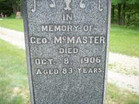 CemSearch: Name: George McMasters; Born: - ; Died: Oct 8 1906; Age: 83; ID: GRENWD117; Other names: McMasters, Maria [Potts]( -1902); Cemeetery: Greenwood Cemetery, Conc A, Lot 24, Brighton Twp., Smithfield Village; Note: Husband of Maria Potts (https://www.cemsearch.ca/burial/?pID=GRENWD117%5E0.)3,2