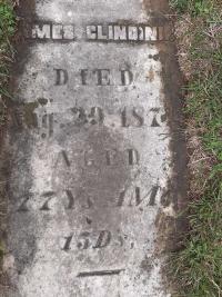 CemSearch: Name: James Clindinin; Born: - ; Died: Aug 29 1872; Age: 77y 1m 15d; ID: MTCRML057; Cemetery: Mount Carmel Cemetery, Conc B, Lot 21, Murray Twp., Northumberland Co., Row 6; Note: Married Mary McMasters March 27, 1828; Father of George (1831-1913), Mary Meyers, Jane Bitton, Chas, James Nelson (1839-1927), John Wm, Wellington, and Finley. (https://www.cemsearch.ca/burial/?pid=MTCRML057%5E0.)2,5