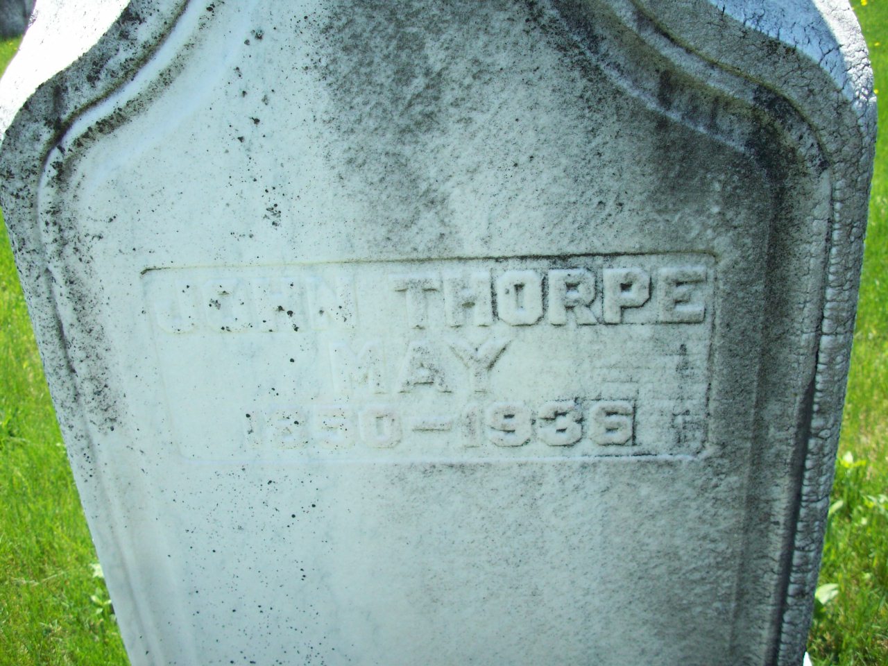 John Thorpe May was born on 4 December 1850 at Murray Twp., Northumberland Co., Ontario; Date 1850 per Memorial. Date Dec 4 1850 & location Murray Twp. per Death Reg'n. Date 1851 & location Ont. per 1891 Census. Date 1852 & location Ont. per 1881 Census. Date 1851 & location Ont. per 1871 Census. Date 1851 & location UC per 1861 Census. Date 1850 & location Cda. per 1851 Census.1,3,4,5,2,6,7 He appeared on the census of 1852 at Murray Twp., Northumberland Co., Ontario; Age 1 at 1851 Census: see Samuel May.3 He appeared on the census of April 1861 at Murray Twp., Northumberland Co., Ontario; Age 10 at 1861 Census: see Samuel May.4 He appeared on the census of April 1871 at Murray Twp., Northumberland Co., Ontario; Age 20 at 1871 Census: see Sameul May.5 He lived in 1878 at Conc B Lot 14, Murray Twp., Northumberland Co., Ontario; County Atlas: Name: John May; Township: Murray; County: Northumberland; Date: 1878; Conc & Lot: B, 14 - 100 acres (County Atlas Map: Murray Twp.)8 He appeared on the census of April 1881 at Murray Twp., Northumberland Co., Ontario; Age 29 at 1881 Census: see Samuel May.1 He lived on 31 May 1883 at Conc B Lot 14, Murray Twp., Northumberland Co., Ontario; Land Registry Records (Grant 3146) show that John May & wife sold 5 and 844/1000 acres of the south part of lot 14, concession B, Murray Twp., Northumberland Co. to Her Majesty the Queen for $385. ITS Date: May 31 1883. Reg'n. Date: Jun 4 1883. (Ontario Land Registry Records, Northumberland Co., Murray Twp., Book 003, pg 102 of 261, page copied from OnLand.ca by Dan Buchanan, Jul 22 2020.)9 He appeared on the census of April 1891 at Murray Twp., Northumberland Co., Ontario; Age 40 at 1891 Census: see George May (brother.)6 He appeared on the census of April 1891 at Murray Twp., Northumberland Co., Ontario; Age 40 at 1891 Census: May, John, 40, b. Ont., p.b. Ireland, CE, farmer, single (1891 Census: Murray Twp., Northumberland Co., dist. 98, sub-dist. g-2, pg. 11m line 20 - ancestry.com.)6 He died on 30 June 1936 at Conc A & B Lot 13 & 14, Murray Twp., Northumberland Co., Ontario, at age 85; Death Reg'n.#026355: Name: John Thorpe May; Date: Jun 30 1936; Age: 85y 6m 26d; Res.: Conc A & B, Lot 13 & 14, Murray Twp; Born: Murray Twp., Dec 4 1850; Status: widowed; Occ.: retired farmer; Nat.: Irish; Parents: Samuel; May, b. Ireland & Lucinda Hetherington, b. Ireland; Inf.: H. s. May, RR#4, Trenton, Nephew; Burial: Carrying Place, Jul 2 1936; Und; G. H. Cobley, Trenton; Cause: myocardial disease; Phys.: John W. Farley, Trenton; Reg'd.: Jul 2 1936; Reg'r.: Edward Nelson (Ontario Death Registration, #026355-1936, ancestry.com.)10 He was buried on 2 July 1936 at Carrying Place Cemetery, Murray Twp., Carrying Place, Northumberland Co., Ontario; Memorial: (See Exhibit) John Thorpe; May; 1850 - 1936 (Carrying Place Cemetery, Murray Twp., Northumberland Co., May 12 2012) Date of Death Jun 30 1936 per Death Reg'n.2,7