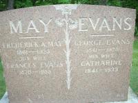 Frederick Allen May was born on 15 October 1861 at Murray Twp., Northumberland Co., Canada West; Date 1861 per Memorial. Date Oct 1862 & location Ont. per 1911 Census. Date Oct 15 1866 & location Ont. rural per 1901 Census. Date 1863 & location Ont. per 1891 Census. Date 1862 & location Ont. per 1881 Census. Date 1863 & location Ont. per 1871 Census.1,6,7,8,3,5 He appeared on the census of April 1871 at Murray Twp., Northumberland Co., Ontario; Age 8 at 1871 Census: see Samuel May.6 He appeared on the census of April 1881 at Murray Twp., Northumberland Co., Ontario; Age 19 at 1881 Census: see Samuel May.1 He appeared on the census of April 1891 at Murray Twp., Northumberland Co., Ontario; Age 28 at 1891 Census: May, Fred, 28, b. Ont., p.b. Ireland, Ce, farmer, single (1891 Census: Murray Twp., Northumberland Co., dist. 98, sub-dist. g-2, pg. 11, line 6 - ancestry.com.)7 He married Frances Hattie Evans, daughter of George Evans and Catharine McMaster, on 22 January 1896 at Murray Twp., Northumberland Co., Ontario; Marriage Reg'n.#009276: Groom: Fred A. May; Age: 34; Res. & Born: Murray; Status: bachelor; Occ.: farmer; Parents: Samuel & Lucinda May; Bride: Frances H. Evans; Age: 25; Res. & Born: Murray; Status: spinster; Parents: George & Catharine Evans; Wit.: Fred Flindall & Maude Evans, Smithfield; Date: Jan 22 1896; Place: Murray Twp; Rel.: CE & Meth; Performed by: H. V. Montier; Reg'r.: T. R. Garratt, Murray Twp. (Ontario Marriage Registration, #009276-1896, ancestry.com.)9 Frederick Allen May appeared on the census of April 1901 at Murray Twp., Northumberland Co., Ontario; Age 34 at 1901 Census: May, Frederick, 34, b. Ont. r. Oct 15 1866, Irish, Meth., farmer, married; Frank(f), 30, b. Ont. r. Dec 13 1876, Irish, Meth., married (1901 Census: Murray Twp., Northumberland Co., dist. 95, sub-dist. g-1, pg. 4, line 46 - ancestry.com.)8 He lived in 1911 at Conc B Lot 15, Murray Twp., Northumberland Co., Ontario; Residence per 1911 Census: Conc B, Lot 15, Murray Twp.3 He appeared on the census of 1911 at Murray Twp., Northumberland Co., Ontario; Age 48 at 1911 Census: May, Frederick A., 48, b. Ont. Oct 1862, Eng., Meth., farmer, married; Frances H., 40, b. Ont. Dec 1870, Eng., Meth., married; Gladys E., 5, b. Ont. Sep 1905, daughter 1911 Census: Murray Twp., Northumberland Co., dist. 101, sub-dist. 22-1, pg. 11, line 7 - Conc B, Lot 15 - ancestry.com.)3 He was buried in 1925 at Greenwood Cemetery, Smithfield, Northumberland Co., Ontario; Memorial: (see Exhibit) MAY; Frederick A. May; 1861 - 1925; His Wife; Frances Evans; 1870 - 1955; EVANS; George Evans; 1841 - 1925; His Wife; Catharine; 1841 - 1933 (Greenwood Cemetery, Smithfield, by Dan July 1 2013.)5 He died in 1925 at Ontario; Date 1925 per Memorial.5