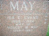 CemSearch: Name: Robert W. May; Born: 1859; Died: 1943; Age: 84y; ID: CRENWD219; Other names: May, Ida E. [Evans] (1865-1924); Cemetery: Greenwood Cemetery, Conc A, Lot 24, Brighton Twp., Smithfield, Northumberland Co; Note: Husband of Ida E. Evans (https://www.cemsearch.ca/burial/?pid=GRENWD219%5E0.)8,5 He died in 1943 at Ontario; Date 1943 per Memorial & CemSearch.8,5