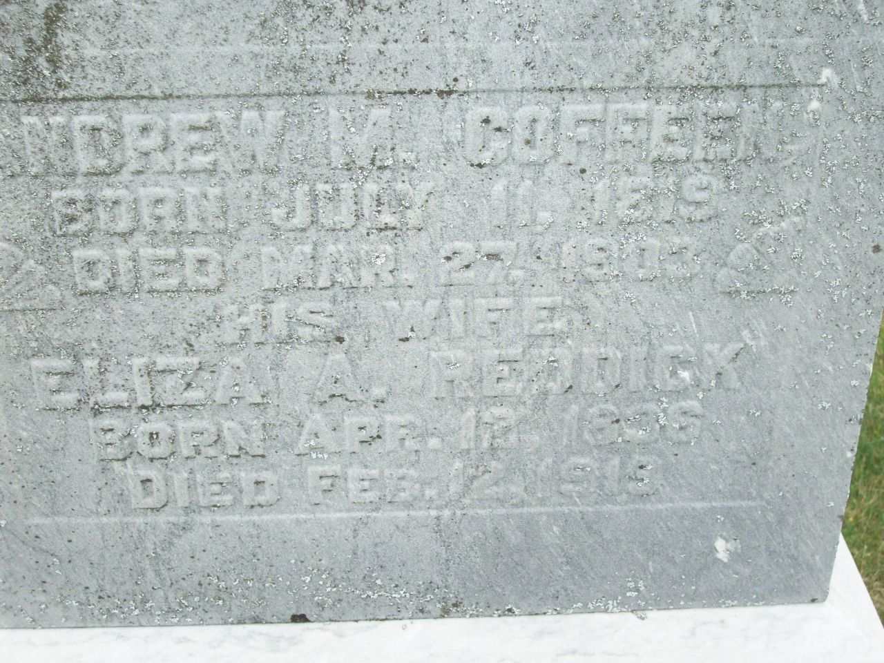 CemSearch: Name: Eliza A. Coffeen; Maiden: Reddick; Born: Apr 12 1836; Died: Feb 12 1919; ID: SALEM0399; Other names: Coffeen, Andrew M. (1819-1903); Cemetery: Salem Cemetery, Conc 1 Lot 21, Cramahe Twp., Sec 1 Row 14 Plot 5 (https://www.cemsearch.ca/burial/?pID=SALEM0399%5E1.)2,6