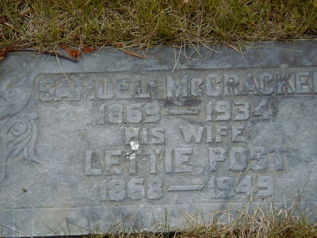 CemSearch: Name: Samuel McCracken; Born: Nov 20 1868; Died: Sep 3 1934; ID: COLBUN499; Other names: McCracken, Lettia [Post](1868-1949); Cemetery: Colborne Union Cemetery, Conc 3 Lot 33, Cramahe Twp., Colborne, Sec A-S Row 12 Plot 2; Note: married (1) Fanny Usborne Dec. 14th, 1892, married (2) Lettie Post McLean, son of George McCracken & Eliza Coyle, Info from Ancestry Members Public Family Tree. (https://www.cemsearch.ca/burial/?pid=COLBUN499%5E0)