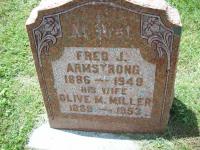 CemSearch: Name: Fred J. Armstrong; Born: Apr 7 1886; Died: 1949; Age: 63y; ID: COLNES099; Other name: Armstrong, Olive Maud [Miller] (1887-1953); Cemetery: Colborne East Cemetery, Conc 1, Lot 29, Cramahe Twp., Village of Colborne,Northumberland Co., Sec N Row 2 Plot 5; Note: married Olive Maud Miller Feb. 5th, 1907 Colborne, Son of Robert Amstrong & Sarah McCrobie. (https://www.cemsearch.ca/burial/?pid=COLBES099%5E0.)3,4