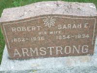 Sarah E. McCobie was born on 24 December 1854 at Matilda Twp., Dundas Co., Canada West; Date 1854 per Memorial. Date Dec 24 1855 & location Ont. rural per 1901 Census. Date 1855 & location Ont. per 1891 Census. Date 1857 & location Ont. per 1881 Census. Date 1855 & location Matilda per marr. reg'n. per marriage reg'n. of son Clarence M. Armstrong. Location Iroquois, Ont. per Death Reg'n. of son Clarence William Armstrong.1,2,4,5,6,3 She lived on 31 December 1879 at Cramahe Twp., Northumberland Co., Ontario; Residence Cramahe per marr. reg'n.1 She married Robert Armstrong, son of Robert Armstrong and Jane Trenear, on 31 December 1879 at Colborne, Northumberland Co., Ontario; Marriage Reg'n.#007357: Groom: Robert Armstrong; Age: 26; Res. & Born: Cramahe Twp; Status: bachelor; Occ.: farmer; Parents: Robert & Jane Armstrong; Bride: Sarah e. McRobie; Age: 24; Res.: Cramahe; Born: Matilda; Wit.: George Armstrong, Cramahe & Maggie Ketchum, Brighton; Date: Dec 31 1879; Place: Colborn; Rel.: WM & Pres; Performed by: Peter McLaren Dunson; Reg'r.: A. Vais, Colborne (Ontario Marriage Registration, #007357-1879, ancestry.com) per marriage reg'n. of daughter son Clarence M. Armstrong.7 Sarah E. McCobie appeared on the census of April 1881 at Cramahe Twp., Northumberland Co., Ontario; Age 24 at 1881 Census: see Robert Armstrong.6 She appeared on the census of April 1891 at Cramahe Twp., Northumberland Co., Ontario; Age 36 at 1891 Census: see Robert Armstrong.4 She appeared on the census of April 1901 at Cramahe Twp., Northumberland Co., Ontario; Age 49? at 1901 Census: see Robert Armstrong.5 She died in 1934 at Ontario; Date 1934 per Memorial.2 She was buried in 1934 at Wood's Cemetery, Cramahe Twp., Northumberland Co., Ontario; Memorial: (See Exhibit) Robert; 1852 - 1936; His Wife; Sarah E; 1754 - 1934; ARMSTRONG (Wood's Cemetery, Cramahe Twp., Jul 6 2009.)2