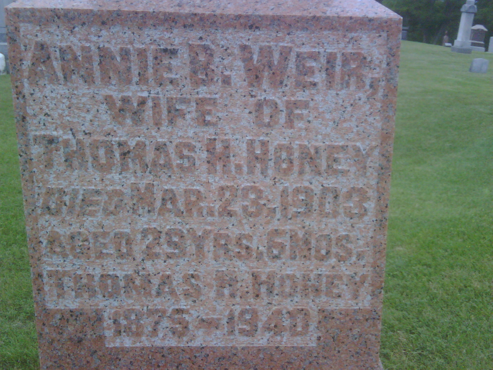 Annie Beatrice Weir was born on 31 August 1873 at Alnwick Twp., Northumberland Co., Ontario; Date Sep 1873 per Memorial - age 29y 6m at death Mar 23 1903. Date 1874 per CemSearch. Date Aug 31 1873 & location Ont. rural per 1901 Census. Date 1873 & location Alnwick Twp. per marriage reg'n. Date Aug 31 1873 & location Alnwick Twp. per family tree of Alfred_Honey on ancestry.com, Feb 23 2012. per marriage reg'n. of daughter Effie Isabelle ( Honey) Merrill.1,2,5,3,4 She married Thomas Henry Honey, son of James Honey and Jane Sanders, on 15 August 1896 at Percy Twp., Warkworth, Northumberland Co., Ontario; Marriage Reg'n.#009236: Groom: Thomas Henry Honey; Age: 22; REs. & Born: Percy Twp; Status: bachelor; Occ.: farmer; Parents: James & Jane Honey; Bride: Annie Beatrice Weir; Age: 22; Res.: Percy Twp; Born: Alnwick Twp; Status: spinster; Parents: William & Isabella Weir; Wit.: Willie & Libbie Peake, Norham; Date: Aug 15 1896; Place: Norham; Rel.: Meth; Performed by: W. H. Peake, Norham; Reg'r.: R. P. Hurlbut, Percy Twp. (Ontario Marriage Registration, #009236-1896, ancestry.com) Date Aug 15 1896 & location Warkworth per family tree of Alfred_Honey on ancestry.com, Feb 23 2012. per marriage reg'n. of daughter Effie Isabelle ( Honey) Merrill.6,2 Annie Beatrice Weir lived on 15 August 1896 at Percy Twp., Northumberland Co., Ontario; Residence Percy Twp. per marriage reg'n.1 As of 15 August 1896,her married name was Honey.1 She appeared on the census of 6 April 1901 at Haldimand Twp., Northumberland Co., Ontario; Age 27 at 1901 Census: see Thomas H. Honey.4 She died on 23 March 1903 at Ontario at age 29; Date Mar 23 1903 per Memorial & CEMSearch. Date Mar 23 1903 per family tree of Alfred_Honey on ancestry.com, Feb 23 2012.2,5,3 She was buried on 25 March 1903 at Warkworth Cemetery, Warkworth, Northumberland Co., Ontario; Memorial: (See Exhibit) Annie B. Weir; Wife of; Thomas H. Honey; Died Mar. 23, 1903; Aged 29Yrs, 6 Mos; Thomas H. Honey; 1875-1940 (Warkworth Cemetery, Warkworth, Jul 7 2009)