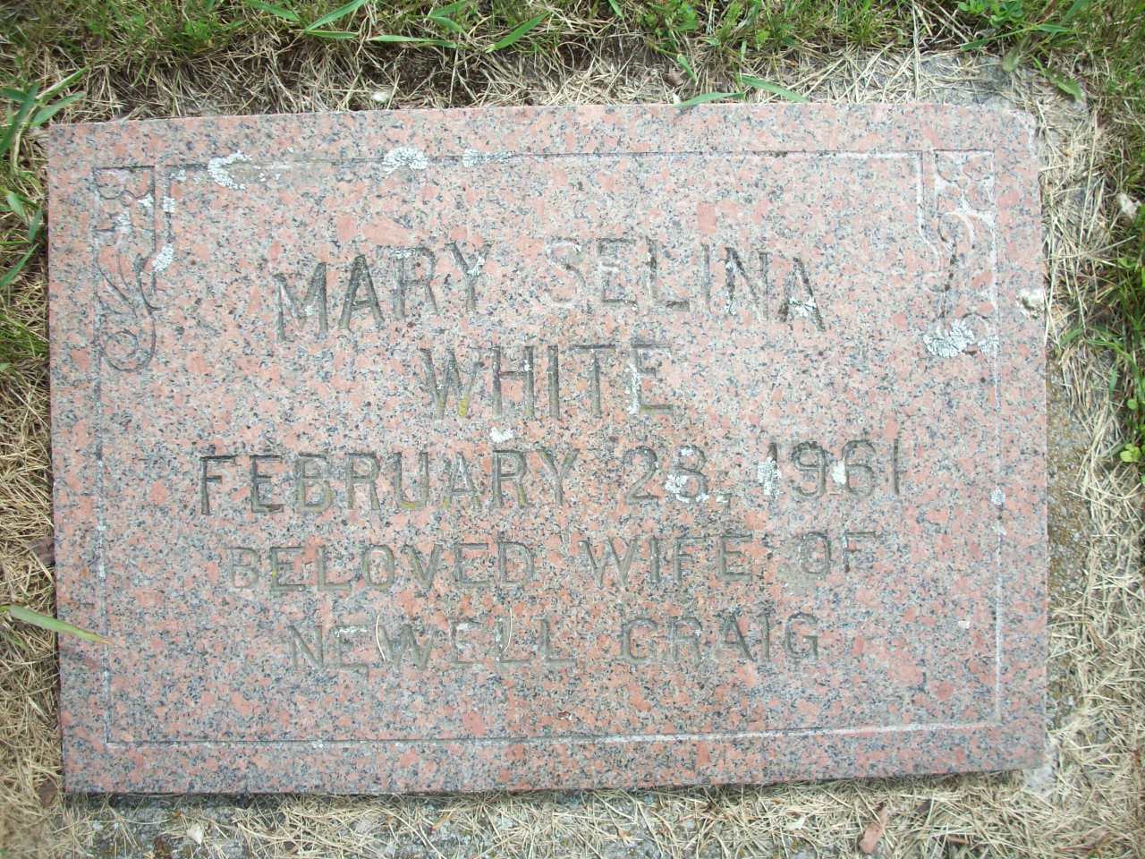 per Memorial.1,4 Mary Selina "Minnie" White lived on 16 April 1955 at 29 Elizabeth St. (Village Lot 22, Perry Ave. West), Brighton, Northumberland Co., Ontario; Land Registry Record (Administrative Grant 9054) show that Minnie S. Craig (widow) Administrator of Newell H., Craig, deceased, in her personal capacity, William N. Craig & wife granted "Part, as see deed. Recitals", Lot 22, Perry Ave. West, Brighton Village, Northumberland Co. to Oscar W. Van Blaricom for $3,000 and mortgage for $1,500. ITS Date: Apr 16 1955. Reg'n. Date: May 16 1955. (Ontario Land Registry Records, Northumberland Co., Brighton Village, Book 006, page 124 of 282, OnLand.ca.)5 She died on 28 February 1961; Date Feb 28 1961 per Memorial.1 She was buried on 1 March 1961 at Woods Cemetery, Cramahe Twp., Northumberland Co., Ontario; Memorial: (See Exhibit) Mary Selina; White; February 28, 1961; Beloved Wife of; Newell Craig (Woods Cemetery, Cramahe Twp., May 23 2011.)1