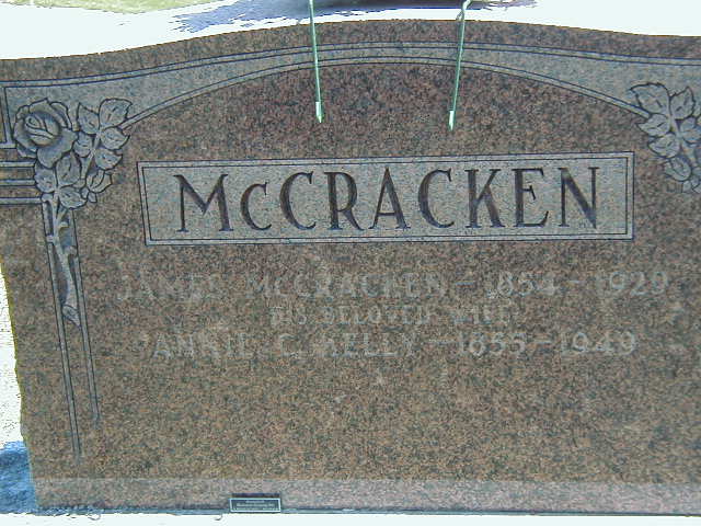 James McCracken was born on 10 December 1854 at Alnwick Twp., Northumberland Co., Ontario; Date Dec 10 1854 & location Ont. rural per 1901 Census. Date 1854 & location UC per 1861 Census. Date 1854 & location Alnwick Twp. per marr. reg'n. Date 1854 per family tree of Alfred_Honey on ancestry.com, Feb 23 2012.1,2,3,4 He appeared on the census of April 1861 at Alnwick Twp., Northumberland Co., Ontario; Age 7 at 1861 Census: see John McCracken.4 He lived on 26 May 1884 at Percy Twp., Northumberland Co., Ontario; Residence Percy Twp. per marr. reg'n.3 He married Mary Ann Caroline Kelly, daughter of John Kelly and Margaret Rennie, on 26 May 1884 at Percy Twp., Northumberland Co., Ontario; Marriage Reg'n.#007795: Groom: James McCracken; Age: 29; REs.: Percy Twp; Born: Alnwick Twp; Status: bachelor; Occ.: farmer; Parents: John & Mary Ann McCracken; Bride: Mary Ann Caroline Kelly; Age: 28; Res.: Percy Twp; Born: Hamilton Twp; Status: spinster; Parents: John & ? Kelly; Wit.: William David & Mary A. E. Bailey, Percy Twp; Date: May 26 1886; Place: Warkworth; Rel.: Meth; Performed by: Rev. Wm. Buchanan; Reg'r.: R. P. Hurlbut, Percy Twp. (Ontario Marriage Registration, #007795-1884, ancestry.com) per family tree of Alfred_Honey on ancestry.com, Feb 23 2012.1,5 James McCracken appeared on the census of April 1901 at Percy Twp., Northumberland Co., Ontario; Age 46 at 1901 Census: McCracken, James, 46, b. Ont. r. Dec 10 1854, Irish, Meth., farmer, married; Annie C., 46, b. Ont. r. Jan 12 1855, Irish, Meth., married; Grace M., 15, b. Ont. r. Apr 20 1885, daughter; Archie P., 11, b. Ont. r. Mar 12 1890, son; John, 73, b. Ireland Mar 15 1828, immigl 1849, Irish, Meth., retired farmer, widower (1901 Census: Percy Twp., Northumberland Co., dist. 95, sub-dist. h-3, pg. 9, line 18 - ancestry.com.)2 He was buried in 1929 at Warkworth Cemetery, Warkworth, Northumberland Co., Ontario; Memorial: (See Exhibit) McCracken; James McCracken - 1854 - 1929; His Beloved Wife; Annie C. Kelly - 1855 - 1949 (Warwkorth Cemetery, Warkworth, Jun 18 2007.)6 He died in 1929 at Ontario; Date 1929 per Memorial. Date 1929 per family tree of Alfred_Honey on ancestry.com, Feb 23 2012.1,6