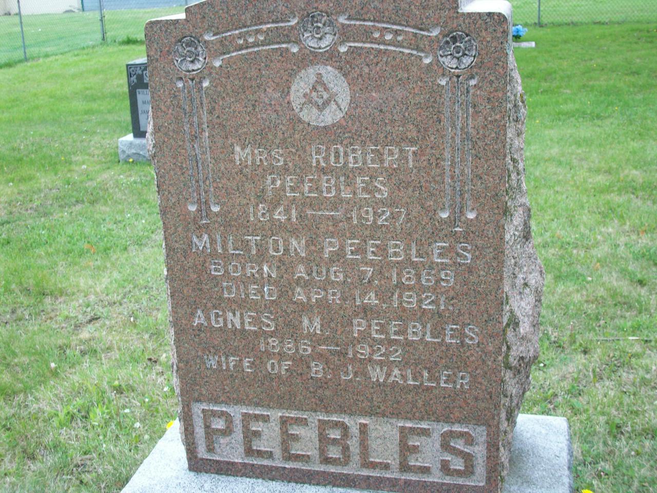 George Milton Peebles was born on 7 August 1869 at Kitley Twp., Leeds Co., Ontario; Date Aug 7 1869 per Memorial. Date Aug 7 1869 & location Ont. rural per 1901 Census. Date 1870 & location Ont. per 1871 Census.1,3,2,4 He appeared on the census of April 1871 at Kitley Twp., Leeds & Grenville Co., Ontario; Age 1 at 1871 Census: see Robert Peebles.4 He appeared on the census of April 1901 at Colborne, Northumberland Co., Ontario; Age 31 at 1901 Census: see Robert Peebles.2 He lived on 1 January 1908 at Colborne, Northumberland Co., Ontario; Witness at marriage of his sister Agnes May (Peebles) Waller.1 He lived on 18 March 1910 at Colborne, Northumberland Co., Ontario; Informant for Death Reg'n. of John Wright.5 He died on 14 April 1921 at Percy St., Colborne, Northumberland Co., Ontario, at age 51; Death Reg'n.#023906: Name: George Milton Peebles; Date: Apr 14 1921; Age: 51y 8m 6d; Res.: Percy St., Colborne, 29 yrs; Born: Kitley Twp., Aug 7 1869; Status: married; Occ.: Owner of "Electic Distribution Service"; Parents: Robert Peebles, b. Ireland & Elizabeth Hannah, b. Ont; Inf.: B. J. Waller, Colborne, brother-in-law; Burial: Colborne, Apr 16 1921; Und.: C. H. Cryderman, Castleton; Phys.: J. Archer Brown, Colborne; Reg'd.: Apr 14 1921; Reg'r.: H. S. Keyes, Colborne (Ontario Death Registration, #023906-1921, ancestry.com) Date Apr 14 1921 per Memorial.3,6 He was buried on 16 April 1921 at Trinity Anglican Church Cemetery, Colborne, Northumberland Co., Ontario; Memorial: (See Exhibit) Mrs. Robert; Peebles; 1841 - 1927; Milton Peebles; Born Aug. 7, 1869; Died Apr. 14, 1921; Agnes M. Peebles; 1886 - 1922; Wife of B. J. Waller (Trinity Anglican Church Cemetery, Colborne, May 8 2012.)3