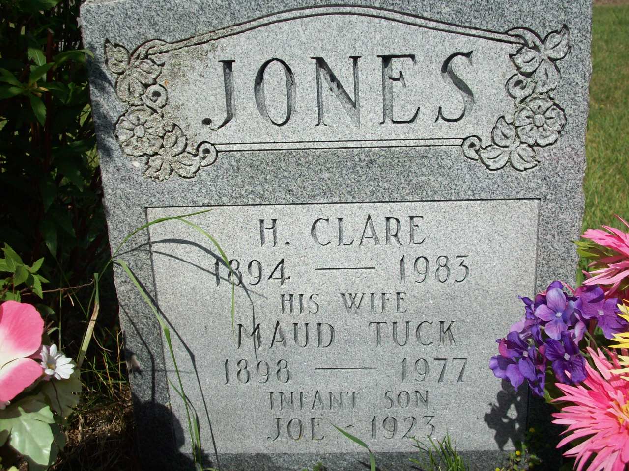 Maud Tuck was born on 28 July 1898 at Cramahe Twp., Northumberland Co., Ontario; Birth Reg'n.# : Name: Maud Tuck; Date: Jul 28 1898; Parents: Earnest Tuck & Jennie Cowie... no pg. 2 ... (Ontario Birth Registration, #... , ancestry.com) Date 1898 & location Ont. per 1921 Census. Date Jul 1899 & location Ont. per 1911 Census. Date 1899 & location Cramahe Twp. per marr. reg'n.1,2,3,4 She appeared on the census of 1911 at Cramahe Twp., Northumberland Co., Ontario; Age 12 at 1911 Census: see Ernest Tuck.3 She lived on 16 May 1917 at Cramahe Twp., Northumberland Co., Ontario; Residence Cramahe Twp. per marr. reg'n.1 She married Henry Clare Jones, son of Arthur Edward Jones and Ella May Darling, on 16 May 1917 at Cramahe Twp., Northumberland Co., Ontario; Marriage Reg'bn.#014255: Groom: Henry Clare Jones; Age: 22; Res. & Born: Cramahe Twp; Status: bachelor; Occ.: farmer; Rel.: Meth; Parents: Arthur E. Jones & Ella May Darling; Bride: Maude Tuck; Age: 18; Res. & Born: Cramahe Twp; Status: spinster; Rel.: Meth; Parents: Earnest Tuck & Jennie Cowie; Expected Res.: Cramahe Twp; Wit.: Theo H. B. Jones, RR 1, Colborne & Nellie E. Wright, RR 2, Colborne; Date: May 16 1917; Place: Cramahe Twp; Performed by: Jas. Batstone. Colborne, Meth; Sworn: Colborne, May 7 1917; Reg'r.: H. J. Mayhew, Colborne (Ontario Marriage Registration, #014255-1917, ancestry.com.)5 Maud Tuck appeared on the census of 5 June 1921 at Cramahe Twp., Northumberland Co., Ontario; Age 23 at 1921 Census: see Henry Clare Jones.4 She died on 25 April 1977 at Cramahe Twp., Northumberland Co., Ontario, at age 78; Date 1977 per Memorial. Date Apr 25 1977 & location Cramahe Twp. per family tree of JefferyDodds on ancestry.com, June 26 2012.6,7 She was buried on 28 April 1977 at Castleton Cemetery, Castleton, Northumberland Co., Ontario; Memorial: (See Exhibit) JONES; H. Clare; 1894 - 1983; His Wife; Maud Tuck; 1898 - 1977; Infant Son; Joe - 1923 (Castleton Cemetery, Castleton, July 13 2009.)7