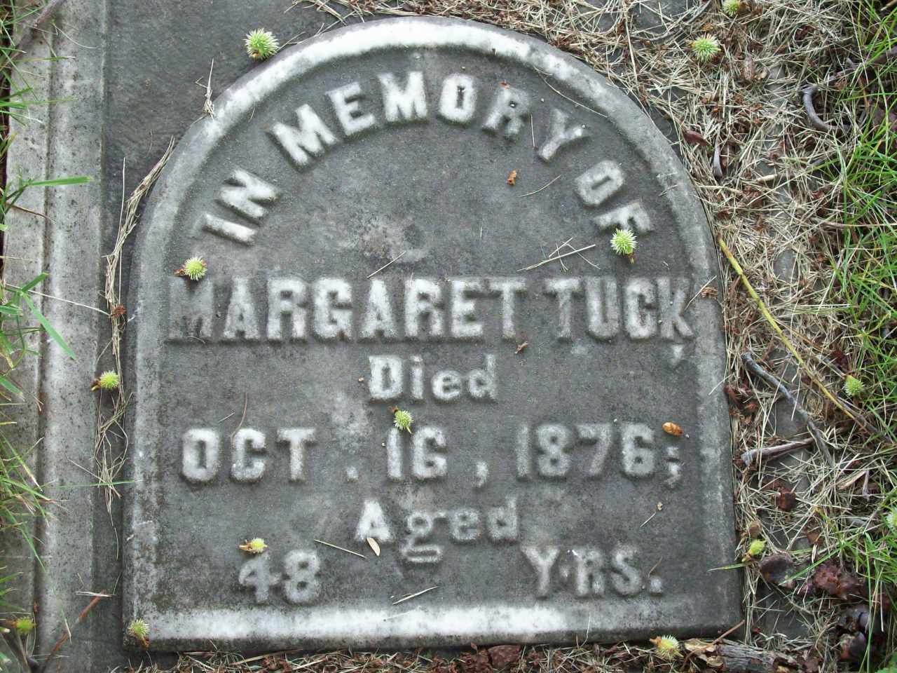 Margaret ? was born in July 1828 at Ireland; Date Jul 1828 & location Ireland per Death Reg'n. - age 48y 3m at death Oct 16 1876. Date 1831 & location England per 1871 Census. Date 1824 & location Ireland per 1861 Census.1,2,3 As of before 1850,her married name was Tuck.1 She married Charles Tuck, son of James Tuck and Martha Bolter, before 1850 at Ontario; per 1871 Census. Per 1861 Census.1,2 Margaret ? appeared on the census of April 1861 at Cramahe Twp., Northumberland Co., Ontario; Age 37 at 1861 Census: see James Tuck (father-in-law.)2 She appeared on the census of April 1871 at Cramahe Twp., Northumberland Co., Ontario; Age 40 at 1871 Census: see Charles Tuck.1 She died on 16 October 1876 at Cramahe Twp., Northumberland Co., Ontario, at age 48; Death Reg'n.#012008: Name: Margaret Tuck; Date: Oct 16 1876; Age: 48y 3m; Born: Ireland; Phys; Dr. Willoughby; Inf.: Charles Tuck (his mark), Cramahe; Reg'd.: Nov 17 1876; Rel.: CE; Reg'r.: J. E. Pennock (Ontario Death Registration, #012008-1876, ancestry.com.)4