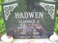 Clarence Stanley Hadwen was born on 5 November 1928 at Saskatchewan; Date 1928 per Memorial. Date 1929 & location Sask per 1931 Census. per Death Notice of Jim Hadwen. Date Nov 5 1928 per family tree of Andrew Joseph Marcel Maheux on ancestry.ca, Jan 4 2026.1,2,4,3 He appeared on the census of 1931 at Sec 6 Twp. 28 Range 19 3M; Age 2 at 1931 Census: see John Herbert Hadwen.2 He married Alice Mae Trottman in January 1952; per family tree of Andrew Joseph Marcel Maheux on ancestry.ca, Jan 4 2026.5,4 Clarence Stanley Hadwen lived on 21 July 1965 at 8 Dundas St. (Lot 2), Brighton, Northumberland Co., Ontario; Land Registry Records (Grant 38700) show that Lillian E. Goodrich sold "said lot", Lot 2, Dundas St. North, Brighton Village, Northumberland Co. to Clarence S. Hadwen & Alice M. Hadwen (Joint Tenants) for $8,000. ITS Date: Jul 21 1965. Reg'n. Date: Jul 21 1965. (Ontario Land Registry Records, Northumberland County, Brighton Village, Book 002, page 269 of 298, OnLand.ca.)6 He lived in 1968 at 8 Dundas St., Brighton, Northumberland Co., Ontario; "110 Hadwen, Clarence, civil servant, 8 Dundas St." & "111 Hadwen, Mrs. Clarence - 8 Dundas St." & "112 Hadwen, Herbert., gentleman, 40 Alice St." & "113 Hadwen, Mrs. Herbert, 40 Alice St." Canada Voters Lists, 1968, Northumberland Co., Brighton Village, pg. 295 of 806, ancestry.ca.5 He lived in 1972 at 8 Dundas St., Brighton, Northumberland Co., Ontario; "146 Hadwen, Clarence, civil servant, 8 Dundas St." & "147 Hadwen, Alice - 8 Dundas St." & "148 Hadwen, Ronald, student, 8 Dundas St." Canada Voters Lists, 1972, Northumberland Co., Brighton Village, pg. 151 of 361, ancestry.ca.5 He lived on 19 April 2002 at 8 Dundas St. (Lot 2), Brighton, Northumberland Co., Ontario; Land Registry Records (Transfer 313786) show that Clarence Stanley Hadwen & Alice Mae Hadwen sold "Planning Act Statements", Lot 2, Dundas St. North, Brighton Village, Northumberland Co. to Daniel McIvor for $125,000. Reg'n. Date: Apr 19 2002. (Ontario Land Registry Records, Northumberland County, Brighton Village, Book 002, page 270 of 298, OnLand.ca.)6 He lived on 1 August 2012 at Brighton, Northumberland Co., Ontario; "Brother of Clarence Hadwen of Brighton .." per Death Notice of Jim Hadwen.1 He died on 18 May 2017 at Brighton, Northumberland Co., Ontario, at age 88; Date May 18 2017 & location Brighton per family tree of Andrew Joseph Marcel Maheux on ancestry.ca, Jan 4 2026.4 He was buried on 21 May 2017 at Greenwood Cemetery, Smithfield, Northumberland Co., Ontario; Memorial: (see Exhibit) HADWEN; Clarence S; 1928 - ; His Beloved Wife; Alice M; 1935 - 2010 (Greenwood Cemetery, Brighton Twp., Smithfield, image by Dan Buchanan, Jul 1 2013.)3