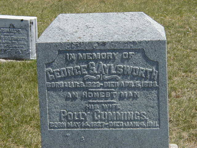 Note: George, Polly and Marshal are at the bottom of page 25 and Ebenezer, age 21 and also a "Joiner" is at the top of page 23 - back a page. Likely a brother??5 He appeared on the census of April 1861 at Percy Twp., Northumberland Co., Ontario; Age 33 at 1861 Census: Aylsworth, George, 33, b. UC, WM, joiner, married; Polly, 34, b. UC, WM, married; Marshal, 11; Olive, 9; William, 4; John, 1 (1861 Census: Percy Twp., Northumberland Co., pg. 90 of 899, line 21 - ancestry.com.)4 He appeared on the census of April 1871 at Percy Twp., Northumberland Co., Ontario; Age 49 at 1871 Census: Aylsworth, George, 49, b. Ont., Eng., WM, farmer, married; Polly, 43, b. Ont., Welsh, WM, married; Marshel, 21, b. Ont., Eng., WM, carpenter, single; Olive, 18; William, 14; John, 10 (1871 Census: Percy Twp., Northumberland Co., dist. 55, sub-dist. F-1, pg. 38, line 4 - ancestry.com.)3 He died on 6 April 1888 at Warkworth, Northumberland Co., Ontario, at age 66; Date 6 1888 per Memorial. Date 1888 & location Warkworth per family tree of joanneboorth53 on ancestry.com, Sep 21 2012.1,2 He was buried on 8 April 1888 at Warkworth Cemetery, Warkworth, Northumberland Co., Ontario; Memorial: (See Exhibit) In Memory of; George S. Aylsworth; Born Marc. 8? 1822 - Died apr. 6, 1888; An Honest Man; His Wife; Polly Cummings; Born May 14, 1827 - Died Jan. 4, 1911 (Warkworth Cemetery, Warkworth, Jun 17 2007.)2