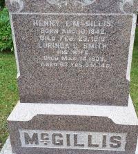 Henry Thomas McGillis was born on 10 August 1842 at Watertown, New York, U.S.A; Date Aug 10 1842 per Memorial. Date Aug 10 1842 & location Watertown, NY per Death Reg'n. - age 76y 6m 13d at death Feb 23 11919. Date Aug 1842 & location Ont. per 1911 Census. Date 1843 & location USA per 1891 Census. Date 1843 & location USA per 1881 Census. Date 1843 & location USA per 1871 Census. Date 1841 & location NY per 1850 Census. per marriage reg'n. of son Henry W. B. McGillis. Date 1842 per marr. reg'n. - Rosaline Elizabeth (Bates) Becker.1,2,4,3,5,6,8,7 He appeared on the census of 23 September 1850 at Watertown, Jefferson Co., New York, U.S.A; Age 9 at 1850 Census: see Tarrenec McGillis.8 He married Lorinda Catherine Smith, daughter of James Smith and Elizabeth Bellyou, circa 1867 at Brighton Twp., Northumberland Co., Ontario; per marriage reg'n. of son Henry W. B. McGillis.1 Henry Thomas McGillis appeared on the census of April 1871 at Brighton Twp., Northumberland Co., Ontario; Age 28 at 1871 Census: McGillis, Henry, 28, b. USA, Irish, EM, farmer, married; Lorinda, 25, b. Ont., Irish, EM, married; Beecher, 3 (1871 Census: Brighton Twp., Northumberland Co., dist. 55, Div. 1, pg. 3, line 18 - ancestry.com.)4 He lived in April 1871 at Conc 3 Lot 3, Brighton Twp., Hilton, Northumberland Co., Ontario; Residence per 1871 Census: Conc 3, Lot 3, Brighton Twp. - Tenant. (This was the property of James Smith, Lorinda's father, south east of Hilton.4 He lived in 1878 at Conc 1 Lot 35, Brighton Twp., Northumberland Co., Ontario; County Atlas: Name: T. H. McGillis; Township: Brighton; County: Northumberland; Date: 1878; Conc & Lot: I, 35 - 50 acres (County Atlas Map, Brighton Twp.)9 He appeared on the census of 1881 at Brighton Twp., Northumberland Co., Ontario; Age 38 at 1881 Census: McGillis, Henry, 38, b. US, Irish, farmer, E.M., married; Lorinda, 35, b. Ont., Irish, E. M., married; Beecher, 13, b. Ont; Frederick, 8 (1881 Census: Brighton Twp., Northumberland Co., dist. 123, sub-dist. C, pg. 20, line 15 - ancestry.com.)1 He appeared on the census of April 1891 at Brighton Twp., Northumberland Co., Ontario; Age 48 at 1891 Census: McGillis, Thomas H., 48, b. USA, p.b. Ireland & USA, Meth., farmer, married; Lorinda, 45, b. Ont., p.b. Ireland & Ont., Meth., married; Beecher, 23, b. Ont., p.b. USA 7 Ont., Meth., farmer, single; Frederick, 18, b. Ont., p.b. USA & Ont., Meth., famrer, single (1891 Census: Brighton Twp., Northumberland Co., dist. 98, sub-dist. a-2, pg. 1, line 1 - ancestry.com.)5 He lived on 15 March 1909 at Brighton Twp., Hilton, Northumberland Co., Ontario; Informant for Death Reg'n. of his wife Lorinada Catherine (Smith) McGillis.6 He lived on 19 October 1910 at Brighton Twp., Hilton, Northumberland Co., Ontario; Residence Hilton per marr. reg'n.2 He married Rosaline Elizabeth "Rose" Bate, daughter of William Bate and Mary Jane Smith, on 19 October 1910 at Brighton Twp., Northumberland Co., Ontario; Marriage Reg'n.#016741: Groom: Thomas Henry McGillis; Age: 68; Status: widower; Rel.: Meth; Res.: Hilton; Parents: Terrance McGillis, farmer, & Nancy Daniels; Bride: Rosaline Elizabeth Becker; Age: 68; Status: widow; Rel.: Meth; Res.: Hilton; Parents: William Bate, farmer, & Mary Jane Smith; Wit.: R. A. & Alice C. Morrow, Hilton; Date: Oct 19 1910; Place: Hilton; Performed by: Rev.: W. H. Buckler, Hilton; Reg'd.: Oct 14 1910; Reg'r.: Fred O. Wade, Brighton Twp. (Ontario Marriage Registration, #016741-1910, ancestry.com.)10 Henry Thomas McGillis appeared on the census of 1911 at Brighton Twp., Hilton, Northumberland Co., Ontario; Age 69 at 1911 Census: McGillis, Henry, 69, b. Ont. Aug 1842, Irish, Meth., farmer, married; Rose E., 69, b. Ont. Nov 1842, Irish, Meth., married (1911 Census: Brighotn Twp., Northumberland Co., dist. 101, sub-dist. 17-3, pg. 12, line 27 - Hilton Village - ancestry.com)