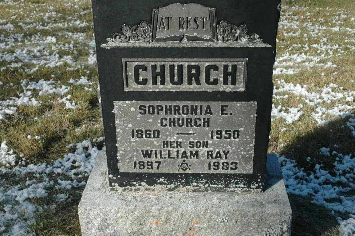 CemSearch: Name: Sophronia E. Church; Maiden: Hutchinson/Bonter; Born: Nov 1860; Died: 1950; Age: 90y; ID: CRYPLCCP0657; Other names: Church, H. Burton (1891-1977), Church, Jessie I;Jordan] (1896-1975), Church, William Ray (1864-1983); Cemetery: Carrying Place Cemetery, Conc C, Lot 9, Murray Twp., Northumberland Co; Note: Widow, Daughter of Jonathan and Margaret Hutcchinson; married William Daniel Church 25, contractor, born P.E. Cty, from Murray Twp., Dec 19 1889 in Murray Twp. No husband shown. (https://www.cemsearch.ca/burial/?pid=CRYPLCCP0657%5E0.)4 She died in 1950 at Ontario; Date 1950 per Memorial & CemSearch.4,5