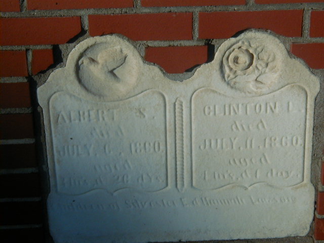Note: Something wrong with dates and ages for Albert S. & Clinton L. Lawson on twin memorial at Vansicklen Cemetery. Are they twins? What we see does not work either way??1,2 He died on 6 July 1860 at Brighton Twp., Northumberland Co., Canada West; per Lawson Book, pg. 215.1 He was buried on 8 July 1860 at Vansicklen Cemetery, Brighton Twp., Northumberland Co., Canada West; Memorial: (See Exhibit) Albert S; Died; July 6, 1860; Aged; 4? M's & 20 D'ys; Clinton L; Died; July 11, 1860; Aged; 1 M's & 1 day; Children of Silvester and Hannah Lawson (Vansicklen Cemetery, Cty. Road 64 & Boes Rd., Sep 23 2005.)2