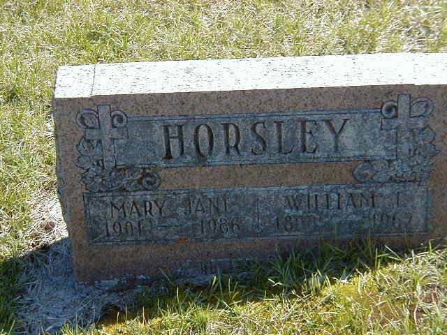 CemSearch: Name: Mary Jane Horsley; Born: 1901; Died: 1986; Note: Wife of William T. Horsely; Other names: Horsely, William T. (1898-1962); Cemetery: Codrington Roman Catholic Cemetery, Old Wooler Road, Conc 5 Lot 34, Brighton Twp. (http://www.cemsearch.ca/burial/?action=sameStoneGroup&selSameStoneChoice=39265.)3,4 She died in 1986 at Ontario; Date 1986 per CemSearch & Memorial.3,4