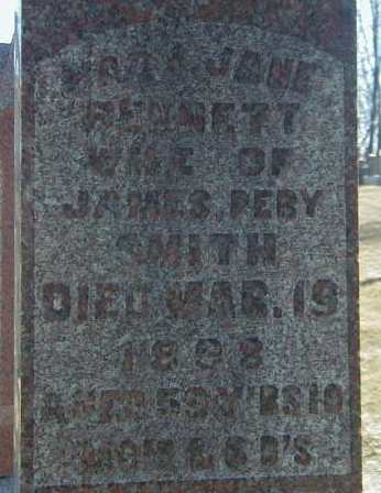 Mary Jane Bennett was born on 13 May 1838 at Northumberland Co., Upper Canada; Date May 13 1838 per CemSearch - age 59y 10m 6d at death Mar 19 1898. Date 1839 & location Ont. per 1891 Census. Date 1839 & location Ont. per 1881 Census. Date 1839 & location Ont. per 1871 Census. Date 1835 & location UC per 1861 Census. Date 1837 & location Cda. per 1851 Census. per family tree of Eudene123 on ancestry.com, Dec 18 2013.1,2,7,3,4,5,6 She appeared on the census of March 1852 at Brighton Twp., Northumberland Co., Canada West; Age 14 at 1851 Census: see Samuel Bennett.2 She married James "Perry" Smith, son of James Smith and Elizabeth Bellyou, before 1858 at Northumberland Co., Canada West; Date c. 1858 per 1861 Census 0 dau. 1859. per family tree of Eudene123 on ancestry.com, Dec 18 2013.1,5 As of before 1858,her married name was Smith.1 Mary Jane Bennett appeared on the census of April 1861 at Brighton Twp., Northumberland Co., Canada West; Age 23 at 1861 Census: see Perry Smith.5 She appeared on the census of April 1871 at Brighton Twp., Northumberland East Co., Ontario; Age 32 at 1871 Census: see James Perry Smith.6 She appeared on the census of April 1881 at Brighton Twp., Northumberland East Co., Ontario; Age 42 at 1881 Census: see Perry Smith.4 She appeared on the census of April 1891 at Brighton Twp., Northumberland East Co., Ontario; Age 52 at 1891 Census: see Perry Smith.3 She lived on 14 November 1896 at Conc 3 Lot 6, Brighton Twp., Northumberland Co., Ontario; Land Registry Records (QC Grant 7125) show that Stanley B.R. Smith James Smith granted the rights to 50 acres of the north east quarter of lot 6, conc 3, Brighton Twp. to Mary J. Smith for $600. ITS Date: Nov 14 1896. Reg'n. Date: June 27 ?? . (Ontario Land Registry Records, Northumberland Co., Conc 3, Lot 6, pg. 163 of 320, pg. 01, page copied from OnLand.ca by Dan Buchanan, Apr 13 2020.)8 She died on 19 March 1898 at Ontario at age 59; Date Mar19 1898 per CemSearch.7 She was buried on 21 March 1898 at Mount Hope Cemetery, Brighton, Northumberland Co., Ontario; Memorial: (see Exhibit) Mary Jane; Bennett; Wife of; James Perry; Smith; Died Mary 19; 1898; Aged 59 Y'rs 10; Mos. & 6 D's (Mount Hope Cemetery, Brighton, Apr 2 2006, by Dan)