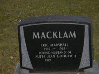 Eric Marshall Macklam was born on 10 September 1915 at Ontario; Date 1915 per Memorial. "Macklam, Eric Marshall; Born September 10, 1915 to Mrs. Ross; September 17, 1915" from index of Brighton Ensign, Trenton Public Library, Dec 21 2013.1,2 He lived on 21 January 1952 at 420 Mountain Park Drive, Hamilton, Wentworth Co., Ontario; Informant for Death Registration of Vera Pearl (Goodrich, Pake) Cline, his mother-in-law.)3 He was buried in 1983 at Salem Cemetery, Cramahe Twp., Salem, Northumberland Co., Ontario; Memorial: (See Exhibit) MACKLAM; Eric Marshall; 1915 - 1983; Loving Husband of; Austa Jean Goodrich; 1919 - (Salem Cemetery, Cramahe Twp., Sep 24 2004.)1 He died in 1983; Date 1983 per Memorial.1