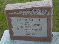 Leah Messenger was born in April 1882 at England; Date 1881 & location England per 1921 Census. Date Apr 1882 & location England per 1911 Census. per Birth Reg'n. of daughter Maude Whitehouse.1,2,3 She married John Whitehouse, son of Richard Whitehouse and Harriet Stevenson, on 29 January 1900 at Birmingham, England; Date Jan 29 1900 & location Birmingham, England per Birth Reg'n. of son Samuel Whitehouse. Date Jan 29 1900 & location Beriningham, England per Birth Reg'n. of daughter Charlotte Whitehouse. per Birth Reg'n. of daughter Maude Whitehouse.1 As of 29 January 1900,her married name was Whitehouse.1 Leah Messenger immigrated in 1904 to Ontario; Immigration 1904 - per 1911 Census.2 She appeared on the census of 1 June 1911 at Brighton Twp., Northumberland Co., Ontario; Age 29 at 1911 Census: see John Whitehouse.2 She appeared on the census of 3 June 1921 at Brighton Twp., Northumberland Co., Ontario; Age 40 at 1921 Census: see John Whitehouse.3 She died on 8 July 1973 at Ontario at age 91; Date July 8 1973 per Memorial.4 She was buried on 11 July 1973 at Greenwood Cemetery, Smithfield, Northumberland Co., Ontario; Memorial: (See Exhibit) Leah Messenger; Wife of; John Whitehouse; Died July 8, 1973; Their Infant Children; Edith; Edward (Greenwood Cemetery, Smithfield, July 9 2004.)4