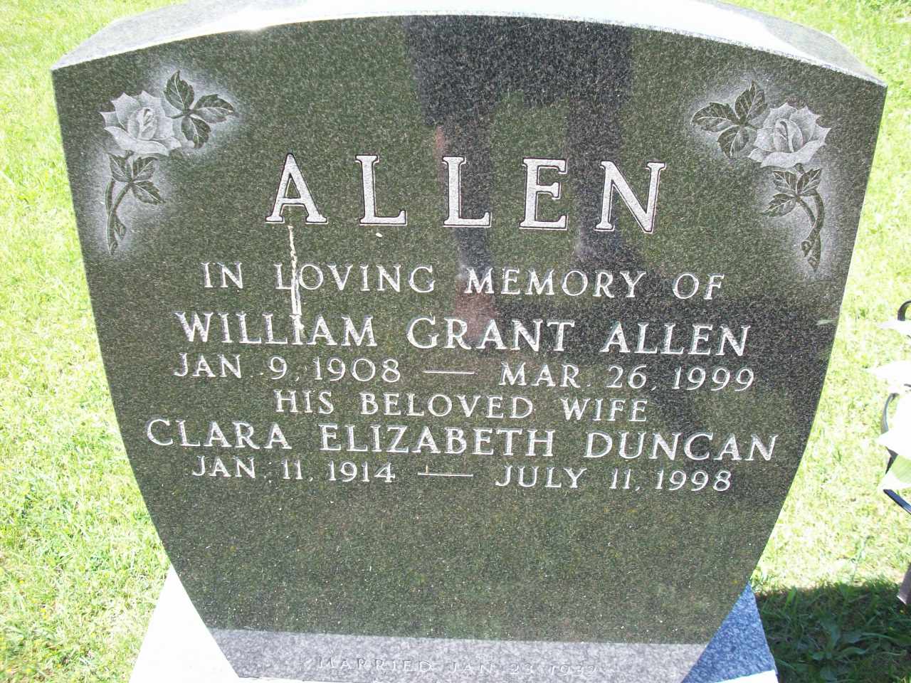 Date Jan 23 1932 per "The Losie Family" sent to me via email by Garth Allen, Jul 11 2014. per Memorial. Date Jan 23 1932 per family tree of wstableford on ancestry.ca, 2017 01 19.2,9,10,11 William "Grant" Allen lived on 7 March 1938 at Warkworth, Northumberland Co., Ontario; Informant for Death Reg'n. of his father Thomas Alfred Allen.1 He lived on 8 August 1955 at Lot 8a, 30 Bayshore Rd., Presqu'ile Point, Northumberland Co., Ontario; Land Registry Records (Quit Claim Grant 15090) show that Samuel J. Batt & wife granted "part lot 8, between the road and the bay, as see deed", Lot 8, Bayshore Rd., Presqu'ile Point, Northumberland Co. to William G. Allen & Clara E. Allen (Joint Tenants) for #,500. ITS Date: Aug 8 1955. Reg'n. Date: Aug 12 1955. (Ontario Land Registry Records, Northumberland Co., Brighton Vilalge, Book 013, pg. 137 of 198, OnLand.ca.)12 He lived on 4 August 1959 at Lot 8a, 30 Bayshore Rd., Presqu'ile Point, Northumberland Co., Ontario; Land Registry Records (Quit Claim Grant 23683) show that William G. & Clara E. Allen granted "part lot 8, Perry Plan", Lot 8a, Bayshore Rd., Presqu'ile Point, Northumberland Co. to Clarence H. & Ruth C. Atkins (Joint Tenants) for $6,000. ITS Date: Aug 4 1959. Reg'n. Date: Oct 9 1959. (Ontario Land Registry Records, Northumberland Co., Brighton Vilalge, Book 013, pg. 139 of 198, OnLand.ca.)12 He died on 26 March 1999 at Warkworth, Northumberland Co., Ontario, at age 91; Date Mar 26 1999 per Memorial. Date Mar 26 1999 & location Warkworth per family tree of wstableford on ancestry.ca, 2017 01 19.2,10 He was buried on 28 March 1999 at Warkworth Cemetery, Warkworth, Northumberland Co., Ontario; Memorial: (See Exhibit) ALLEN; In Loving Memory of; William Grant Allen; Jan. 9, 1908 - Mar. 26, 1999; His Beloved Wife; Clara Elizabeth Duncan; Jan. 11, 1914 - July 11, 1998 (Warkworth Cemetery, Warkowrth, Jul 5 2009.)1,2