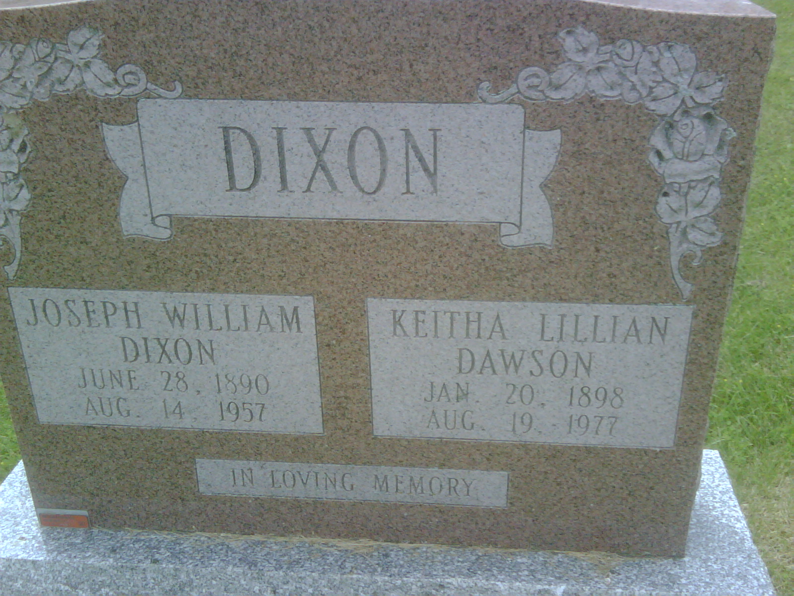 Joseph William Dixon was born on 28 June 1890 at Sheffield, England; Date Jun 28 1890 per Memorial. Date 1890 & location England per 1921 Census. Date 1890 & location Sheffield, England per marriage reg'n.1,2,3 He lived on 8 December 1920 at Percy Twp., Northumberland Co., Ontario; Residence percy Twp. per marriage reg'n.1 He married Keitha Lillian Dawson, daughter of Robert Bruce Dawson and Margaret Ann "Maggie" Hopkins, on 8 December 1920 at Percy Twp., Warkworth, Northumberland Co., Ontario; Marriage Reg'n.#020487: Groom: Joseph Wm. Dixon; Age: 30; Res.: Percy Twp; Born: Sheffield, England; Status: bachelor; Occ.: Machanic; Rel.: Anglican; Parents: Jos. Wm. Dixon & Maria Grieves?; Bride: Keitha Lillian Dawson; Age: 22; Res.: Percy Twp; Born: Cramahe Twp; Status: spinster; Occ.: Post Mistress; Rel.: Pres; Parents: Robert Dawson & Margaret Hopkins; Expected Res.: Warkworth; Wit.: Jessie M. Blake, Warkworth & D. H. Hulbert, Toronto; Date: Dec 8 1920; Place: Warkworth; Performed by: Russell, mcGillivray?, Warkworth, Pres; Sworn: Warkworth, Dec 7 1920; Reg'r.: Thos. A. Allen, Warkworth (Ontario Marriage Registration, #020487-1920, ancestry.com.)4 Joseph William Dixon appeared on the census of 8 June 1921 at Percy Twp., Warkworth, Northumberland East Co., Ontario; Age 31 at 1921 Census: Dixon, Joseph, 31, b. England, p.b. England, iimig. 1908, English, CE, auto mechanic at garage, married; Keitha, 22, b. Ont., p.b. Ont., CE, married (1921 Census: Percy Twp., Northumberland Co., dist. 108, sub-dist. 37, pg. 10, line 25 - Village of Warkworth - ancestry.ca.)3 He lived on 18 February 1947 at Village Lot 54, Main St. North, Brighton, Northumberland Co., Ontario; Land Registry Records (Grant 7745) show that Joseph W. Dixon & wife sold part of Village Lot 54, Brighton Village, Main St. North side, Northumberland Co. to Clayton Smith for $1,900. ITS Date: Feb 18 1947. Reg'n. Date: Feb 19 1947. (Ontario Land Registry Records, Northumberland Co., Brighton Village, Book 004, Pg. 386 of 399, Village Lot 54, Main St. North Side, (Conc 1, Lot 2, Brighton Twp.) page copied from OnLand.ca by Dan Buchanan Apr 13 2023.)5 He lived on 18 February 1947 at Village Lot 54, Main St. North, Brighton, Northumberland Co., Ontario; Land Registry Records (Grant 7744) show that Anna H. M. Blakely (widow) sold part of Village Lot 54, Brighton Village, Main St. North side, Northumberland Co. to Joseph W. Dixon for $2,500. ITS Date: Feb 18 1947. Reg'n. Date: Feb 19 1947. (Ontario Land Registry Records, Northumberland Co., Brighton Village, Book 004, Pg. 386 of 399, Village Lot 54, Main St. North Side, (Conc 1, Lot 2, Brighton Twp.) page copied from OnLand.ca by Dan Buchanan Apr 13 2023.)5 He died on 14 August 1957 at Ontario at age 67; Date Aug 14 1957 per Memorial.2 He was buried on 17 August 1957 at Warkworth Cemetery, Warkworth, Northumberland Co., Ontario; Memorial: (See Exhibit) DIXON; Joseph William; Dixon; June 28, 1890; Aug. 14, 1957; Keitha Lillian Dawson; Jan. 20, 1898; Aug. 19, 1977 (Warkworth Cemetery, Warkworth, Jul 12 2009.)2