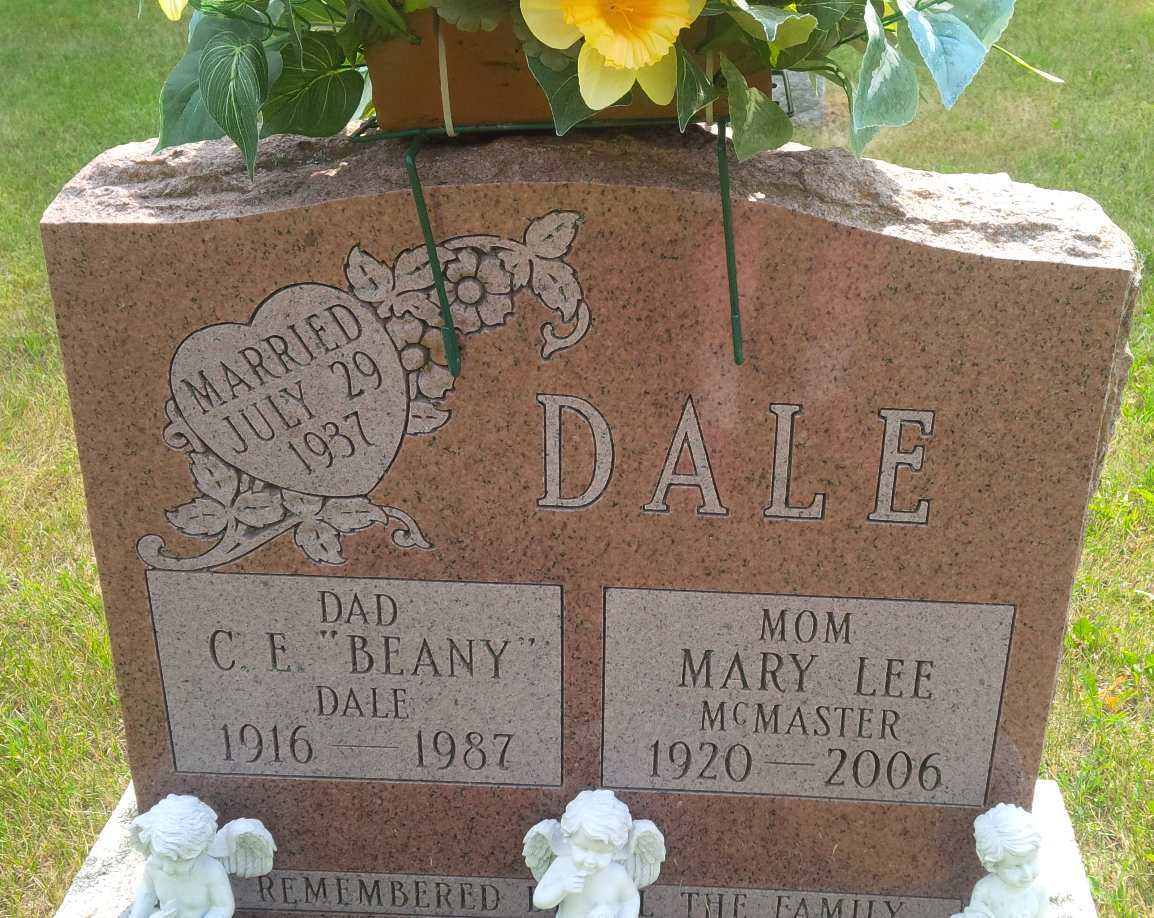 per Obit of Gerald Allan "Beany" Dale.1,8 Clarence Edward "Beany" Dale lived on 3 April 1940 at Brighton, Northumberland Co., Ontario; Witness at marriage of Claude Crawford Dale & Betty Lorraine Dusnebury.6 He lived in 1949 at Brighton, Northumberland Co., Ontario; "138 Dale, Clarence, labourer, Brighton" & "139 Dale, Mrs. Clarence - Brighton" Canada Voters Lists, 1949, Northumberland Co., pg. 44 of 156, ancestry.ca.9 He lived in 1953 at Brighton, Northumberland Co., Ontario; "54 Dale, Clarence, Electrician, Brighton" & "55 Dale, Mrs. Clarence - Brighton" & "56 Dale, Glendon, labourer, Brighton" & "57 Dale, Mrs. Glendon, Brighton" Canada Voters Lists, 1953, Northumberland Co., pg. 58 of 170, ancestry.ca.9 He lived in 1958 at Brighton, Northumberland Co., Ontario; "26 Dale, Clarence, Electrician, Brighton" & "27 Dale, Mrs. Clarence - Brighton" Canada Voters Lists, 1958, Northumberland Co., pg. 67 of 187, ancestry.ca.9 He "Clarence Dale & Sons Electrical Contr. - 1958 - 1994 - Oliphant to Chapel" from page 229 of "History of Brighton Businesses" by Susan Brose. in 1958 at Oliphant St., Brighton, Northumberland Co., Ontario.10 He lived in 1965 at 24 Oliphant St., Brighton, Northumberland Co., Ontario; "20 Dale, Clarence, Electrician, 24 Oliphant St., Brighton" & "21 Dale, Mrs. Mary, 24 Oliphant St., Brighton" & "22 Dale, Glasby, labourer, 5 Perry Ave., Brighton" & "23 Dale, Mrs. G., 5 Perry Ave., Brighton" & "Dale, Ronald, Electrician, 22 Oliphant St., Brighton" Canada Voters Lists, 1965, Northumberland Co., pg. 18 of 148, ancestry.ca.9 He lived in 1968 at 18 Oliphant St., Brighton, Northumberland Co., Ontario; "35 Dale, Clarence, Electrician, 18 Oliphant St." & "36 Dale, Mrs. Mary - 18 Oliphant St." & "37 Dale, Ron, electrician, 22 Oliphant St." & "38 Dale, Mrs. Carolyn - 22 Oliphant St." Canada Voters Lists, 1968, Northumberland Co., pg. 620 of 806, ancestry.ca.9 He lived on 13 January 1969 at Village Lots 3 & 4, Elizabeth St. South (19), Brighton, Northumberland Co., Ontario; Land Registry Record (Grant 48934) show that Frank Pearsall & Helen E. Pearsall granted "Lot 3 & 4, south Elizabeth St., Plan 52, subject to mortgage", Oliphant St. East, Village Lot 15, Brighton Village, Northumberland Co. to Clarence E. Dale & Mary L. Dale (Joint Tenants) for $15,000. ITS Date: Jan 13 1969. Reg'n. Date: Jan 23 1969. (Ontario Land Registry Records, Northumberland Co., Brighton Village, Book 006, page 049 of 282, OnLand.ca.)11 He lived on 14 October 1970 at Village Lots 3 & 4, Elizabeth St. South (19), Brighton, Northumberland Co., Ontario; Land Registry Record (Grant 56867) show that Clarence E. Dale & Mary L. Dale granted "Lot 3 & 4, south Elizabeth St., Plan 52, T.C attached", Oliphant St. East, Village Lot 15, Brighton Village, Northumberland Co. to Cloverlawn Investments Ltd. for $18,500. ITS Date: Oct 14 1970. Reg'n. Date: Nov 10 1970. (Ontario Land Registry Records, Northumberland Co., Brighton Village, Book 006, page 049 of 282, OnLand.ca.)11 He was buried in 1987 at Shiloh Cemetery, Cramahe Twp., Shiloh, Northumberland Co., Ontario; Memorial: (See Exhibit) DALE; Dad; C. E. "Beany"; Dale; 1916 - 1987; MOM; Mary Lee; McMaster; 1920 - 2006; Married; July 29; 1937 (Shiloh Cemetery, Cramahe Twp., July 6 2014, by Dan.)2 He died in 1987; Date 1987 per Memorial.2