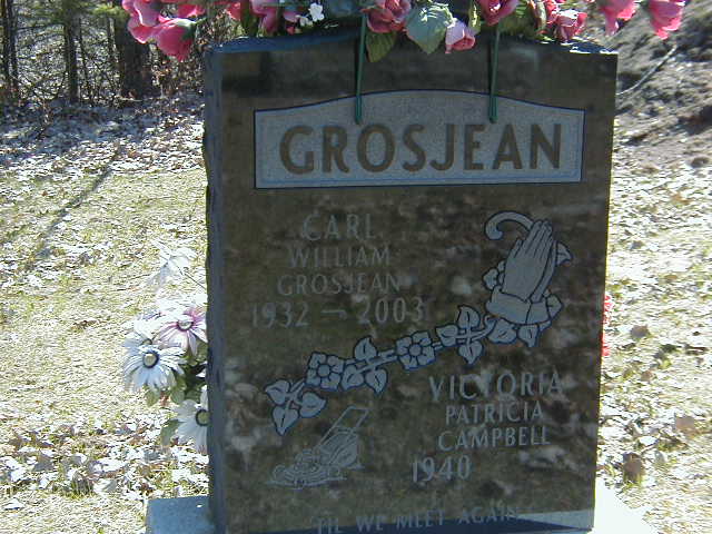Carl William Grosjean was born in 1932 at Ontario; Date 1932 per Memorial.1 He lived in 1963 at R. R. No. 4, Brighton, Northumberland Co., Ontario; "101 Grosjean, Carl, labourer, R.R. No. 4, Brighton; 102 Grosjean, Victoria, -- R.R. No. 4, Brighton" Canada Voters List 1935-1980, Brighton, pg. 67 of 203 - ancestry.com.2 He was buried in 2003 at Roman Catholic Cemetery, Codrington, Northumberland Co., Ontario; Memorial: (See Exhibit) GROSJEAN; Carl ; William; Grosjean; 1932 - 2003; Victoria; Patricia; Campbell; 1940 - (Roman Catholic Cemetery, Codrington, Oct 29 2010.)1 He died in 2003; Date 2003 per Memorial.1