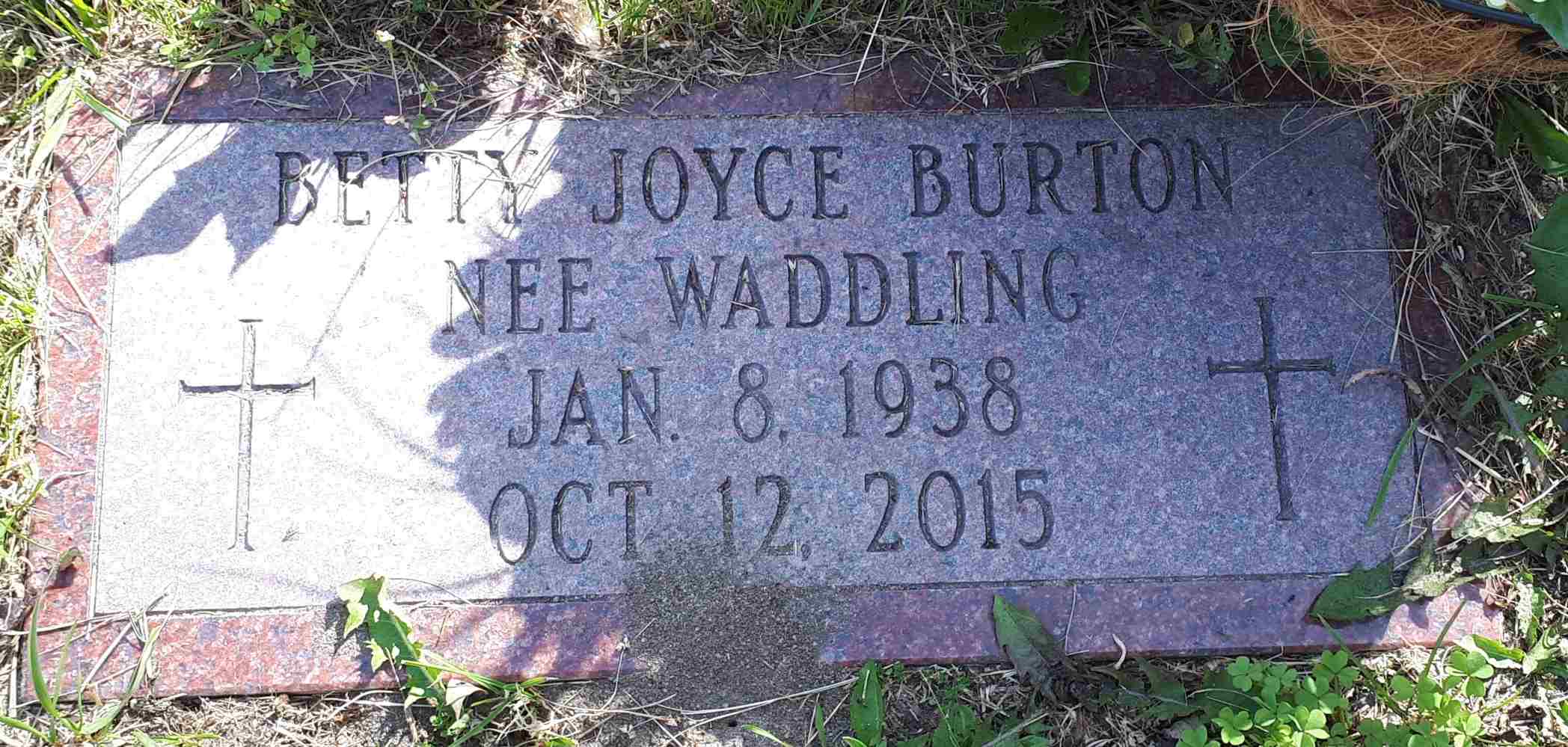 Date Oct 12 2015 per Memorial.1,2 She was buried on 15 October 2015 at Mount Hope Cemetery, Brighton, Northumberland Co., Ontario; Memorial: (see Exhibit) Betty Joyce Burton; Nee Waddling; Jan 8, 1938; Oct. 12, 2015 (Mount Hope Cemetery, Brighton, image by Dan Buchanan, Jun 19 2018.)1