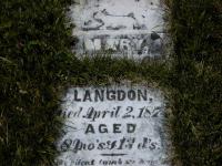 Mary Langdon was born on 20 July 1873 at Brighton Twp., Northumberland Co., Ontario; Date Jul 20 1873 per Memorial - age 8m 13d at death Apr 2 1874. Guessing Mary is dau. of Hannibal???1 She died on 2 April 1874 at Brighton Twp., Northumberland Co., Ontario; Date Apr 2 1874 per Memorial.1 She was buried on 4 April 1874 at Waite's Cemetery, Cramahe Twp., Northumberland Co., Ontario; Memorial: (See Exhibit) Mary; Daughter of; ---- ; Langdon; Died April 2, 1874; Aged; 8 Mo's & 13 d's (Waite's Cemetery, Cramahe Twp., Jul 3 2004)(Note: The stone is broken and grass is growing in the crack right where the name would be. I am guessing that Mary was a daughter of Hannibal Langdon - seems to only one having kids at that time. is this correct?1