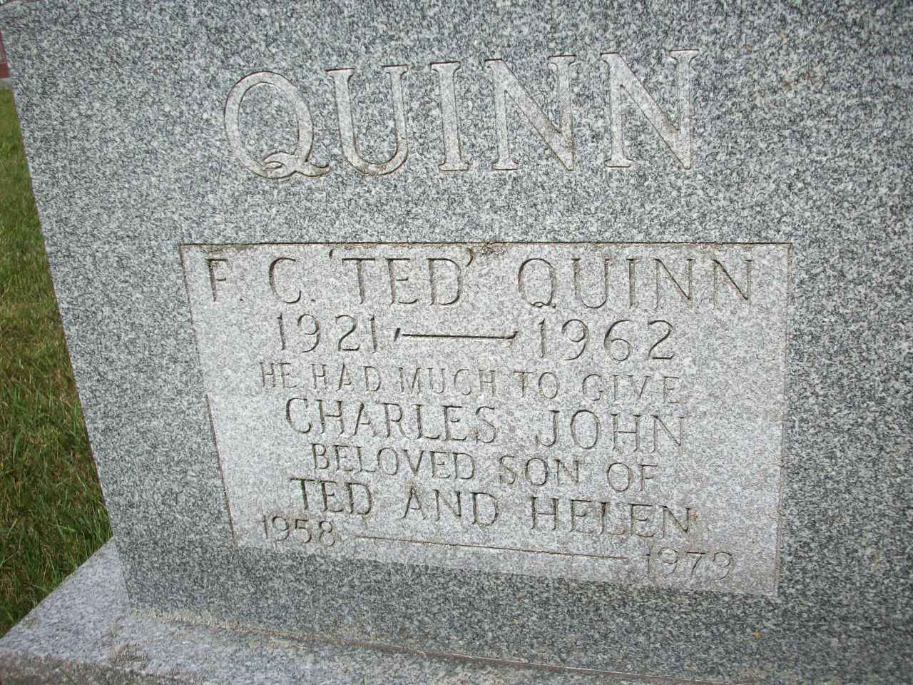 Charles John Quinn was born in 1958; Date 1958 per Memorial.1 He was buried in 1979 at Castleton Cemetery, Castleton, Northumberland Co., Ontario; Memorial: (See Exhibit) QUINN; F. C. Ted Quinn; 1921 - 1962; He Had Much To Give; Charles John; Beloved Son of; Ted and Helen; 1958 - 1979 (Castleton Cemetery, Castleton, July 15 2009.)1 He died in 1979; Date 1979 per Memorial.1