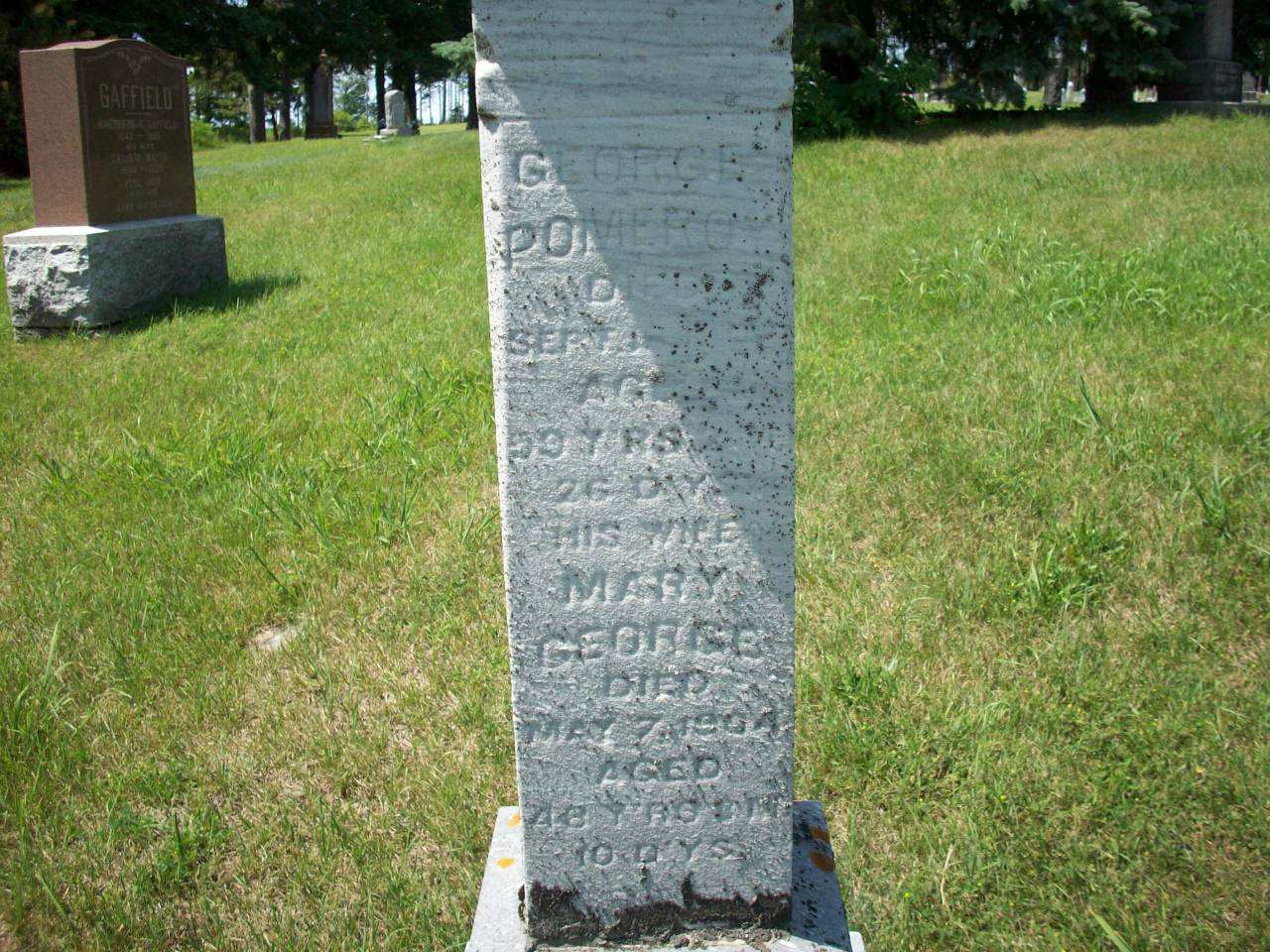 Mary Dennis George was born on 28 January 1856 at Cramahe Twp., Northumberland Co., Canada West; Date 1856 per Memorial - age 48 per Death May 7 1904. Date Jan 28 1855 & location Ont. rural per 1901 Census. Date 1856 & location Ont. per 1891 Census. Date 1857 & location Ont. per 1881 Census. Date 1856 & location Castleton per marr. reg'n. - George Pomeroy. Date Jan 28 1856 per GEDCOM of Carole Sprickerhoff (csprikerhoff@hotmail.com) Sep 17 2017.1,7,2,3,8,4 She lived on 14 December 1878 at Cramahe Twp., Castleton, Northumberland Co., Ontario; Residence Castleton per marr. reg'n. - George Pomeroy.2 As of 14 December 1878,her married name was Pomeroy.1 She married George Pomeroy, son of James Pomeroy and Margaret Huyck, on 14 December 1878 at Belleville, Hastings Co., Ontario; Marriage Reg'n.#003841: Groom: George Pomeroy; Age: 35; Res. & Born: Castleton; Status: widower; Occ.: grocer; Parents: James & Deademma Pomeroy; Bride: Mary George; Age: 22; Res. & Born: Castleton; Status: spinster; Parents: John & Mary George; Wit.: George Moore, Castleton & A. P. Farrell, Belleville; Date: Nov 14 1878; Place: Belleville; Rel.: Meth; Performed by: B. Lane; Reg'r.: r. Newberry, Belleville (Ontario Marriage Registration, #003841-1878, ancestry.ca) per GEDCOM of Carole Sprickerhoff (csprikerhoff@hotmail.com) Sep 17 2017.1,9 Mary Dennis George appeared on the census of April 1881 at Murray Twp., Northumberland East Co., Ontario; Age 24 at 1881 Census: see George Pomeroy.7 She appeared on the census of 23 April 1891 at Cramahe Twp., Northumberland East Co., Ontario; Age 35 at 1891 Census: see George Pomeroy.4 She appeared on the census of 25 April 1901 at Cramahe Twp., Northumberland East Co., Ontario; Age 46 at 1901 Census: see George Pomeroy.8 She died on 7 May 1904 at Cramahe Twp., Northumberland Co., Ontario, at age 48; Date May 7 1904 per Memorial & CemSearch. Date May 7 1904 per GEDCOM of Carole Sprickerhoff (csprikerhoff@hotmail.com) Sep 17 2017.1,3,10 She was buried on 9 May 1904 at Castleton Cemetery, Castleton, Northumberland Co., Ontario; Memorial: (See Exhibit) George; Pomeroy; Died; Sep. 18, 1902; Aged; 59 Y'rs; 26 Dys; His Wife; Mary George; Died; May 7 1904; Aged; 48 Yrs, 3 M; 10 Days (Castelton Cemetery, Castleton, July 13 2009)