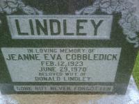 Note: There is a picture of Granville and Jean Cobbledick in uniform in front of their house in Hilton during WWII. Florence Chatten told me their house was west of Hilton Hall, in area where road changed.1,2 As of circa 1945,her married name was Lindley.2 She died on 29 June 1970 at age 47; Date Jun 29 1970 per Memorial. Date Jun 29 1970 per family tree of Prenticelaurie on ancestry.ca, Nov 22 2017.1,2 She was buried on 2 July 1970 at Warkworth Cemetery, Warkworth, Northumberland Co., Ontario; Memorial: (See Exhibit) LINDLEY; In Loving Memory of; Jeanne Eva Cobbledick; Feb. 12, 1923; june 29, 1970; Beloved Wife of; Donald Lundley (Warkworth Cemetery, Warkworth, July 12 2009.)2