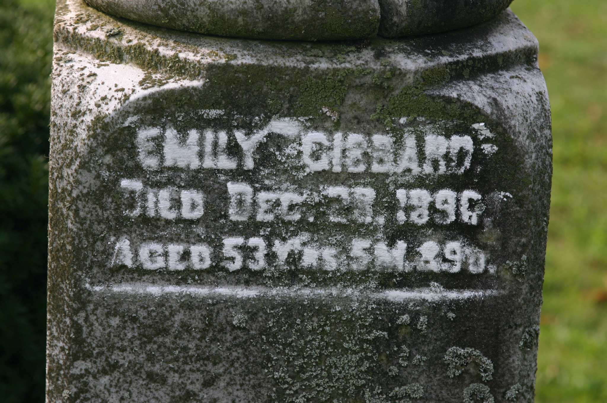 Emily Gibbard was born on 19 July 1843 at Darlington Twp., Durham Co., Canada West; Date July 19 1843 per Memorial - age 53y 5m 9d at death Dec 28 1896. Date Jul 1896 & location Darlington Twp. per Death Reg'n. Dec Date 1851 & location Ont. per 1881 Census. Date 1853 & location CW per 1861 Census. Date 1843 & location Cda. per 1851 Census.1,2,3,4,5 She appeared on the census of 1851 at Darlington Twp., Durham Co., Canada West; Age 8 at 1851 Census: see William Gibbard.4 She appeared on the census of April 1861 at Richmond Twp., Lennox & Addingon Co., Canada West; Age 18 at 1861 Census: see William Gibbard.2 She appeared on the census of April 1881 at Brighton Twp., East Northumberland Co., Ontario; age 30 at 1881 Census: see William Gibbard.1 She died on 28 December 1896 at Brighton Twp., Northumberland Co., Ontario, at age 53; Death Reg'n.#014064: Name: Emily Gibbard; Date: Dec 28 1896; Age: 54y 5m; Occ.: Fine Art Teacher; Born: Darlington Twp; Cause: Pthysis; Phys. & Inf; R. J. Wade, MD. Brighton Village; Reg'd.: Dec 30 1896; Rel; Meth; Reg'r.: D. Crouter (Ontario Death Registration, #014064-1896, ancestry.ca) Date Dec 28 1896 per Memorial.3,6 She was buried on 30 December 1896 at Mount Hope Cemetery, Brighton, Northumberland Co., Ontario; Memorial: (See Exhibit) Emily Gibbard; Died Dec. 28, 1896; Aged 53 Y'rs., 5 M. & 9 D. (Mount Hope Cemetery, Susan Brose CDs, 1 - Oct 3 2005.)3