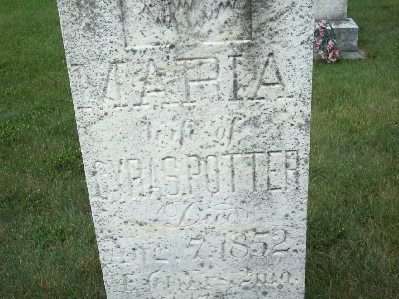 CemSearch: Name: Maria Potter; Born: May 1790; Died: Aug 7 1852l Age: 61; ID: WOODS195; No other names: Cemetery: Woods Cemetery, Conc 1 Lot 12, Cramahe Twp., Northumberland Co., Sec S Row 6 Plot 5 (https://www.cemsearch.ca/burial/?pid=WOODS195%5E0.)2,5