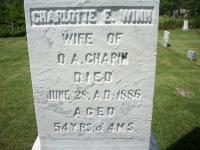 Charlotte Elizabeth Winn was born in February 1832 at Sevenoaks, Kent, England; Date Feb 1832 per Memorial - age 54y 4m at death June 28 1886. Date 1832 & location England per 1881 Census. Date 1833 & location England per 1871 Census. Date 1834 & location England per 1861 Ccensus. per marriage reg'n. of dau. Harriet Eliza (Chapin) Herington. Date 1832 & location Sevenoaks, Kent, England per family tree of BarbaraJElliott28 on ancestry.ca, May 3 02018.1,2,3,4,5,6 She married Otis Allan Chapin, son of Roswell Chapin and Eliza Byers, before 1848 at Canada West; per marriage reg'n. of dau. Harriet Eliza (Chapin) Herington.1 As of before 1848,her married name was Chapin.1 Charlotte Elizabeth Winn appeared on the census of April 1861 at Cobourg, Northumberland Co., Canada West; Age 27 at 1861 Census: see Charles Winn (brother.)6 She appeared on the census of April 1871 at Colborne, East Northumberland Co., Ontario; Age 38 at 1871 Census: see Otis A. Chapin.4 She appeared on the census of April 1881 at Colborne, East Northumberland Co., Ontario; Age 49 at 1881 Census: see Otis A. Chapin.5 She died on 28 June 1886 at Colborne, Northumberland Co., Ontario, at age 54; Date Jun 28 1886 per Memorial. Date Jun 28 1886 & location Colborne per family tree of BarbaraJElliott28 on ancestry.ca, May 3 02018.2,3 She was buried on 30 June 1886 at East Colborne Cemetery, Colborne, Northumberland Co., Ontario; Memorial: (See Exhibit) Charlotte E. Winn; Wife of; O. A. Chapin; Died; June 28, A. D. 1886; Aged; 54 Y'rs & 4 M's (East Colborne Cemetery, Colborne, July 4, 2009.)3