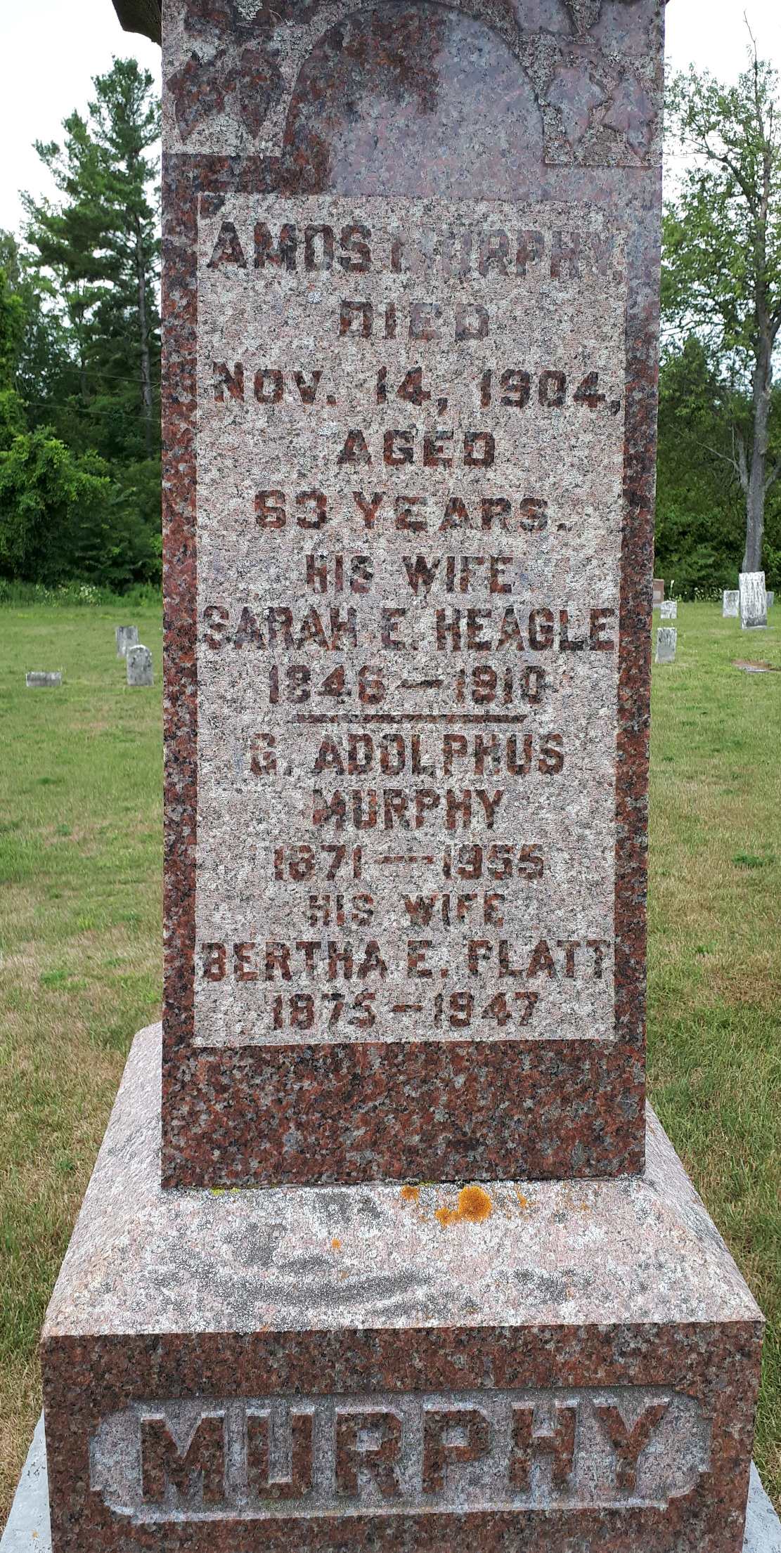 "On Aug 15/1896 he granted 100 acres each of Lot 12/Con 4 to his sons Adolphus and Amos." per email from Patrick Goodmurphy, Jan 23 2024.3,4 He died on 14 November 1904 at Brighton Twp., Northumberland Co., Ontario, at age 63; Date Nov 14 1904 per Memorial. per family tree of 1_janethughed10 on ancestry.ca, Aug 13 2018.1,2 He was buried on 16 November 1904 at Waite Cemetery, Cramahe Twp., Northumberland Co., Ontario; Memorial: (See Exhibit) Amos Murphy; Died; Nov. 14, 1904; Aged; 63 Years; His Wife; Sarah e. Heagle; 1846 - 1910; G. Adolphus; Murphy; 1871 - 1955; His Wife; Bertha E. Platt; 1875 - 1947; MURPHY (Waite Cemetery, Cramahe Twp., Aug 7 2018.)2