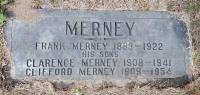 CemSearch: Name: Frank Merney; Born: 1883; Died: 1922; Age: 39; Note: Small flat stone Fater of Clarence & Clifford Merney; Other names: Merney, Clarence (1908-1941), Clifford (1909-1954); Cemetery: Waite Cemetery, Cramahe Twp., Conc 4 Lot 11, Sec A-W Row 3 Plot 5 (http://www.cemsearch.ca/burial/?action=selectionList&choiceBurialID=505234#.)2,3