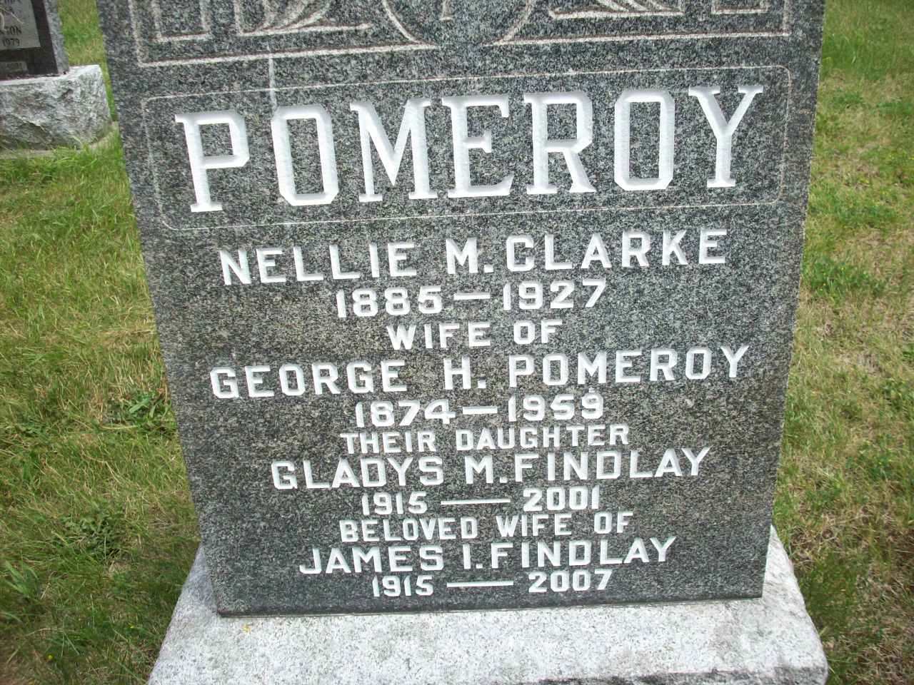 James I. Findlay was born in 1915; Date 1915 per Memorial.1 He married Gladys M. Pomeroy, daughter of George Henry Pomeroy and Nellie M. Clarke, circa 1940; per Memorial.1 James I. Findlay was buried in 2007 at Castleton Cemetery, Castleton, Northumberland Co., Ontario; Memorial: (See Exhibit) POMEROY; Nellie M. Clarke; 1885 - 1927; Wife of; George H. Pomeroy; 1874 - 1959; Their Daughter; Gladys M. Findlay; 1915 - 2001; Beloved Wife of; James I. Findlay; 1915 - 2007 (Castleton Cemetery, Castelton, July 15 2009.)1 He died in 2007; Date 2007 per Memorial.1